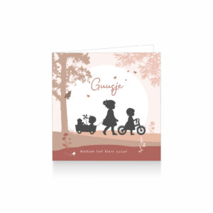273-Super leuk silhouet geboortekaartje voor een derde kindje, een meisje. Op dit kaartje zie je grote zus wandelen met bolderkar met haar kleine baby zusje die speelt met een windmolentje in een bos met prachtige bloemen. Hun andere zusje loopt met een trapfiets voorop.