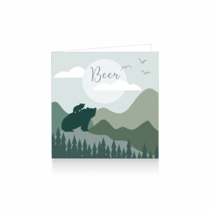 274-lief en schattig geboortekaartje voor een jongen met moeder en zoon beer in de bergen. Het kaartje is in groen tinten.