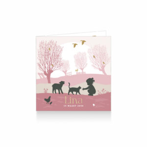 646-Super leuk silhouet geboortekaartje voor een meisje. Op dit leuke kaartje zie je een meisje met boerderijdieren zoals een lammetje, kip met kuiken, kat en kalfje in een Hollands landschap met knotwilgen.