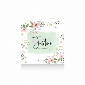 1246-Trendy waterverf geboortekaartje voor een meisje met takjes en roze aquarel bloemen met op de achtergrond lichtgroene aquarel kwaststrepen