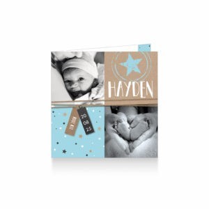 117- hip geboortekaartje voor een jongen met twee foto inzetjes, ster stempel op kraft karton, labeltjes aan touw en sterren en stippen op een lichtblauwe achtergrond