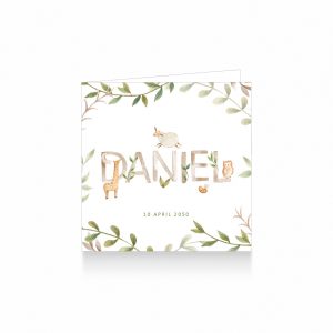 1244-Aquarel alfabet dieren geboortekaartje voor een jongen met de naam van je baby handgeschilderd in blokletters met geschilderde elementen met dieren, bloemen en takjes in waterverf op een witte achtergrond