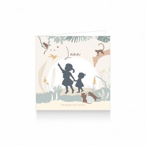 116-Hip jungle silhouet geboortekaartje voor een tweede kindje, een meisje. Op dit leuke kaartje zie je grote zus hand in hand met haar kleine zusje in de jungle tussen prachtige tropische planten en dieren, zoals een giraf, spelende leeuwtjes, aapjes en stokstaartjes. Grote zus wijst naar een vogeltje..