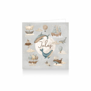 1239-Onder de zee aquarel Ocean dieren geboortekaartje voor een jongen uit de collectie Ocean Dream. Op dit prachtige waterverf kaartje zie je zeeleven, aquarel dieren zoals walvissen, schildpad met kasteel, manta rog, luchtballonnen, maan, sterren en wolken op een grijze verweerde achtergrond.