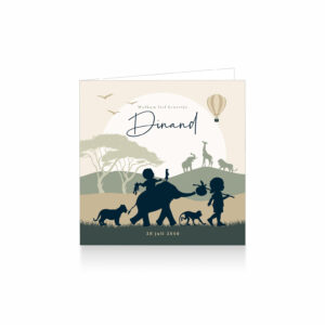 119-Super leuk jungle safari silhouet geboortekaartje voor een tweede kindje, een jongen. Op dit leuke kaartje zie je een grote broer met knapzak met jungle safaridieren die hem volgen met zijn baby broertje op een olifantje, een stokstaartje, aapje en leeuwtje in een prachtig savanne landschap met een luchtballon op de achtergrond.