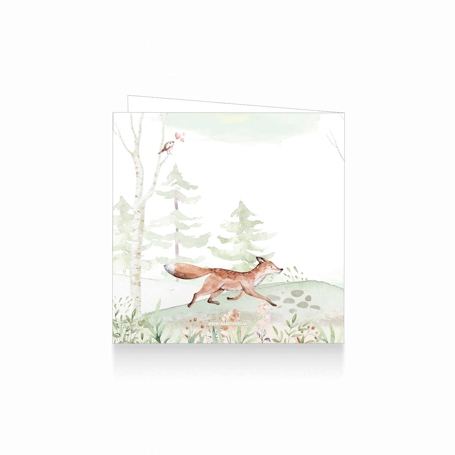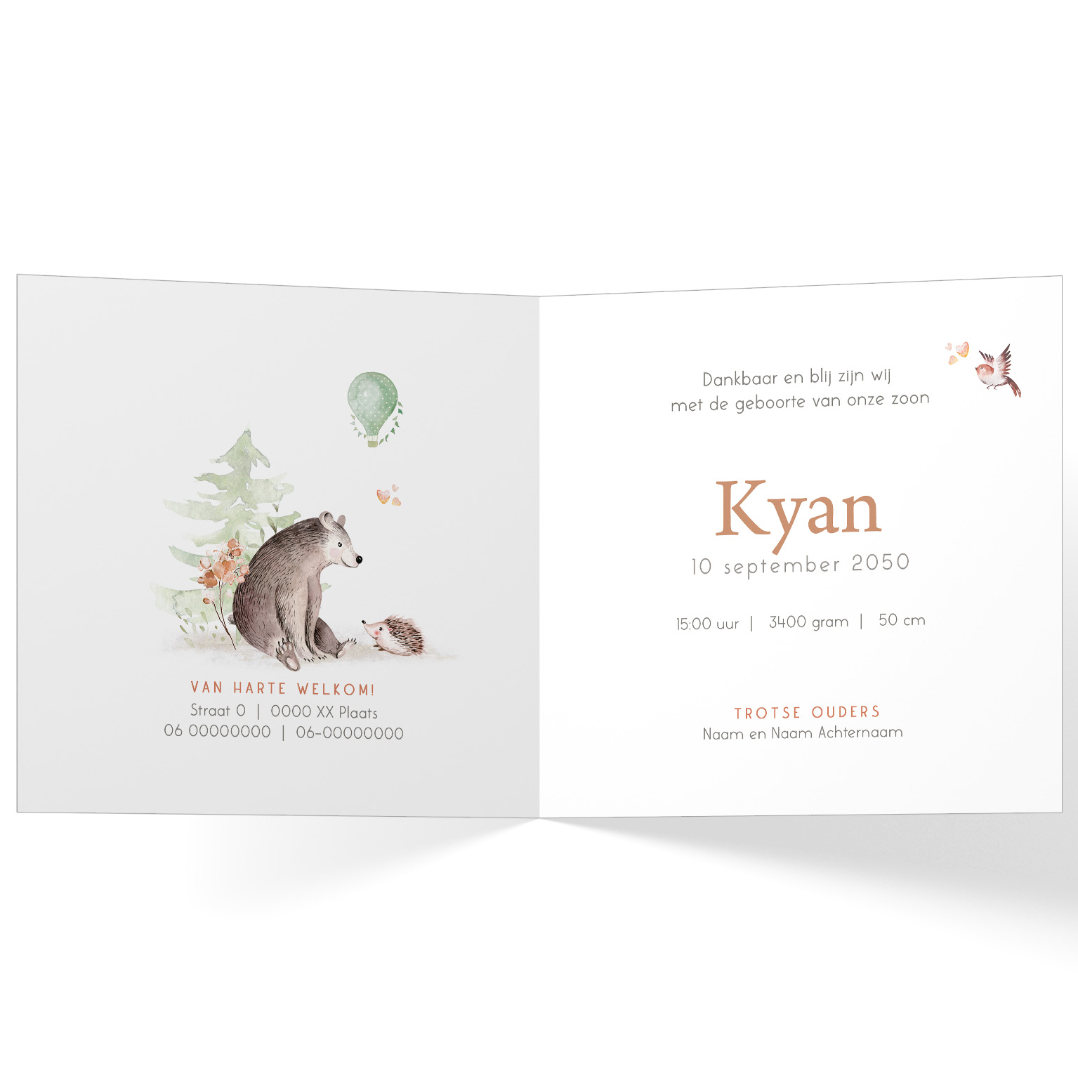 021-Lief waterverf dieren geboortekaartje voor een jongen met handgeschilderde bosdieren zoals twee schattige beertjes, een egeltje, konijntje, uil en vogeltjes in het bos met luchtballon.