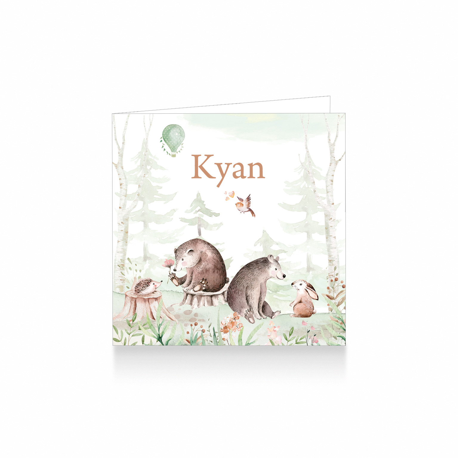 021-Lief waterverf dieren geboortekaartje voor een jongen met handgeschilderde bosdieren zoals twee schattige beertjes, een egeltje, konijntje, uil en vogeltjes in het bos met luchtballon. aantal