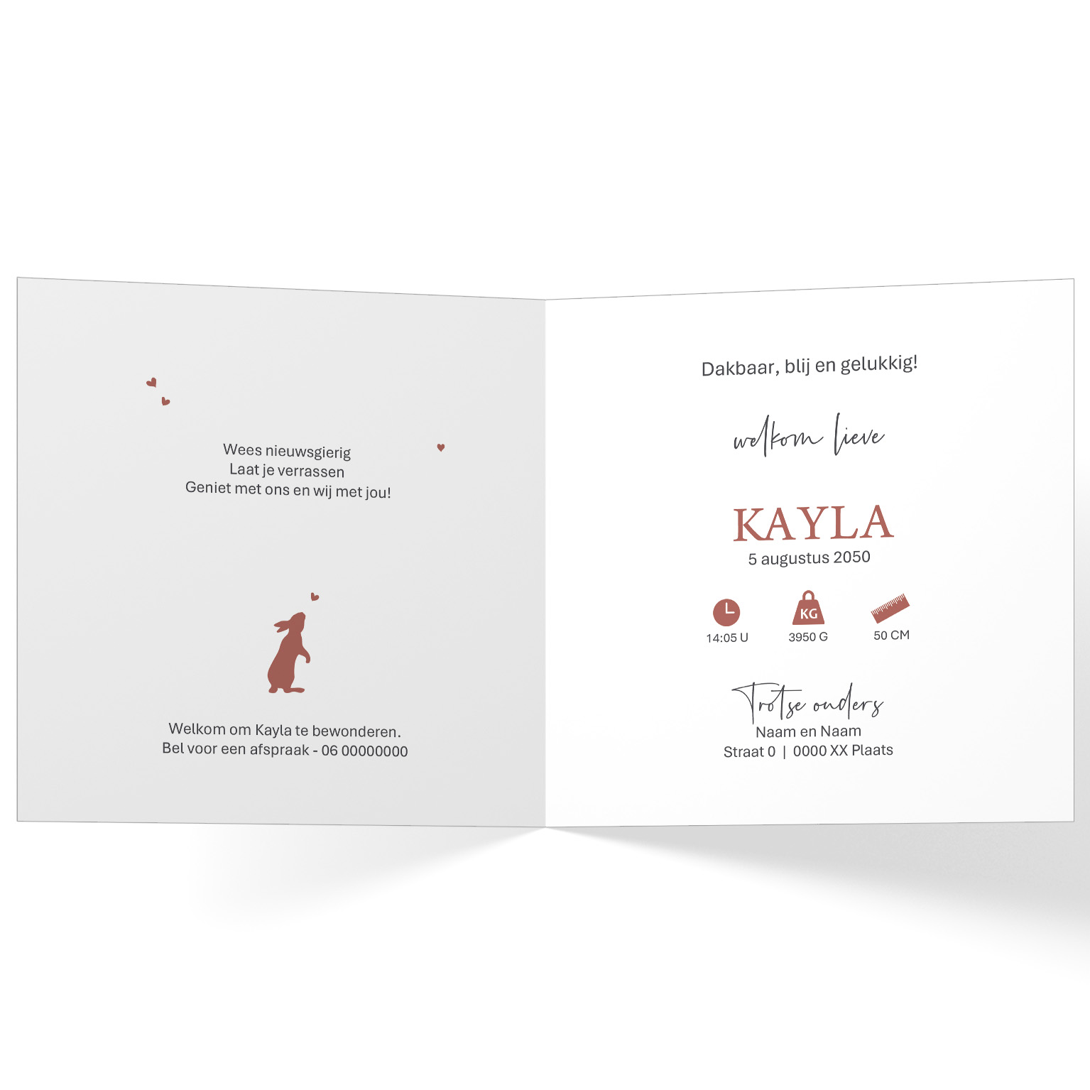 033-Lief silhouet geboortekaartje voor een meisje. Op dit leuke kaartje zie je een klein meisje een klavertje vier geven aan een konijntje tussen bloemetjes op een aquarel achtergrond met hartjes. aantal