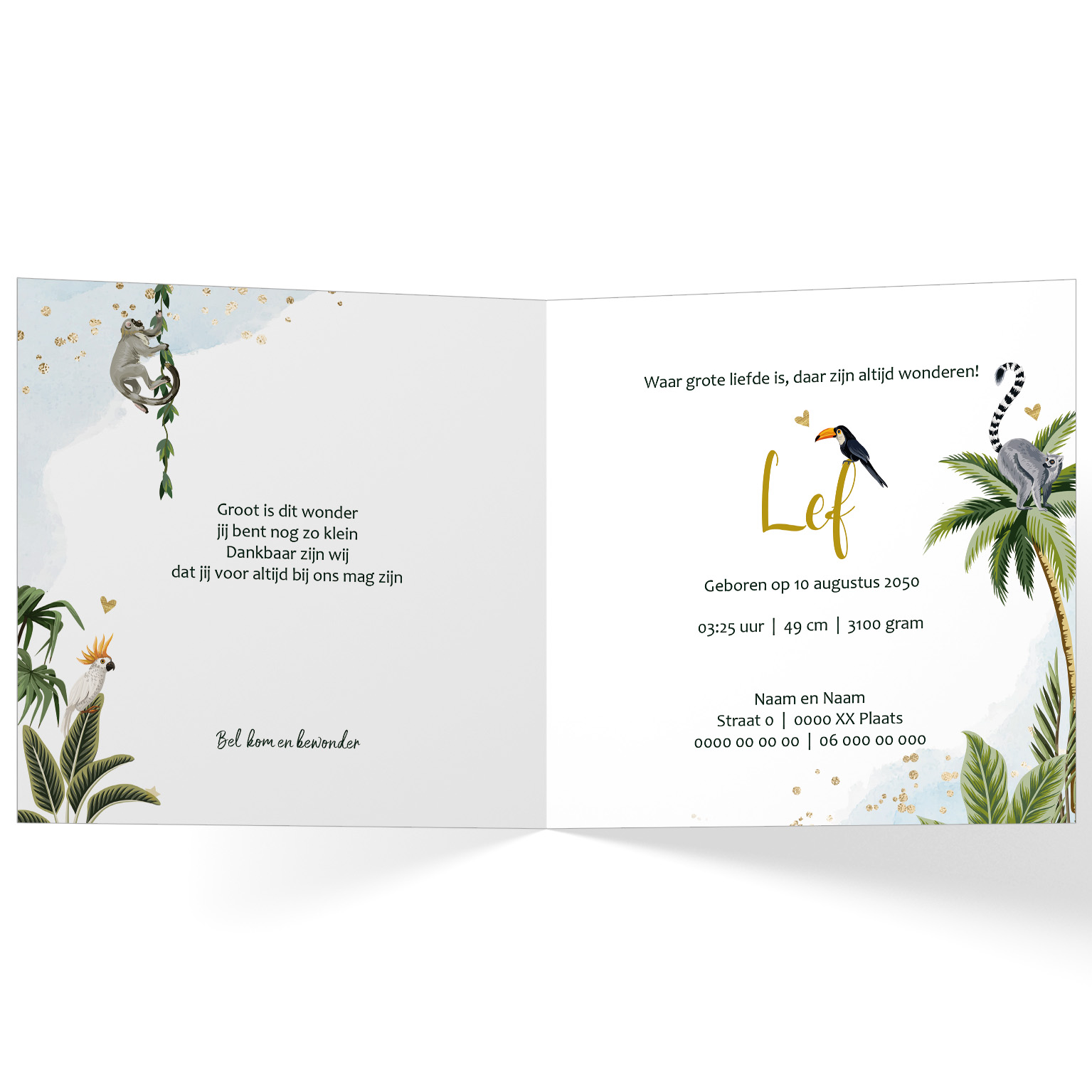 1009-Jungle geboortekaartje voor een jongen met een naamlabel met tropische bladeren, aapjes, luiaard en toekan met lichtblauw aquarel en glitter confetti en hartjes. aantal