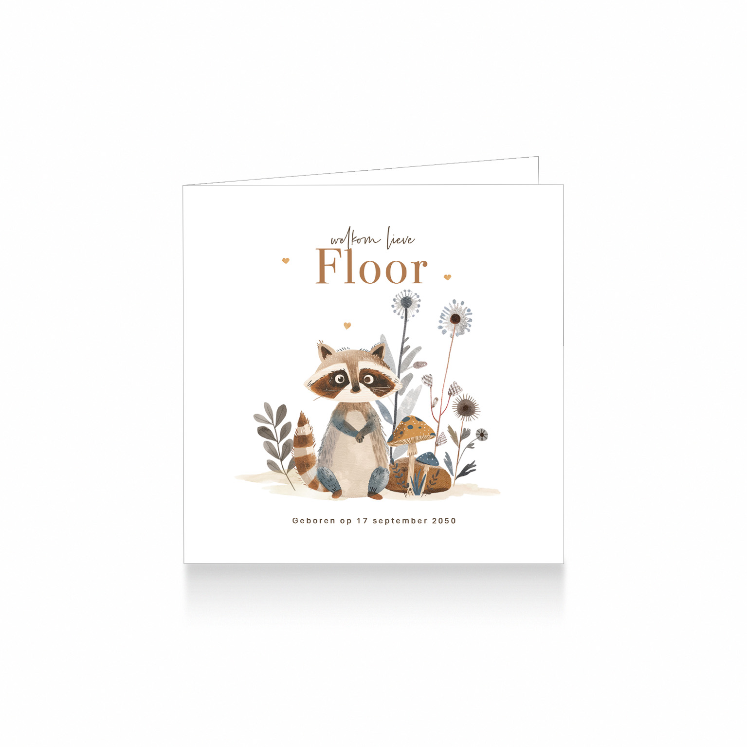 1020-Aquarel bosdieren geboortekaartje voor een jongen of meisje. Op dit lieve kaartje zie je een schattig geschilderd wasbeertje in waterverf tussen prachtige paddenstoelen, bloemen, takjes en hartjes op een witte achtergrond