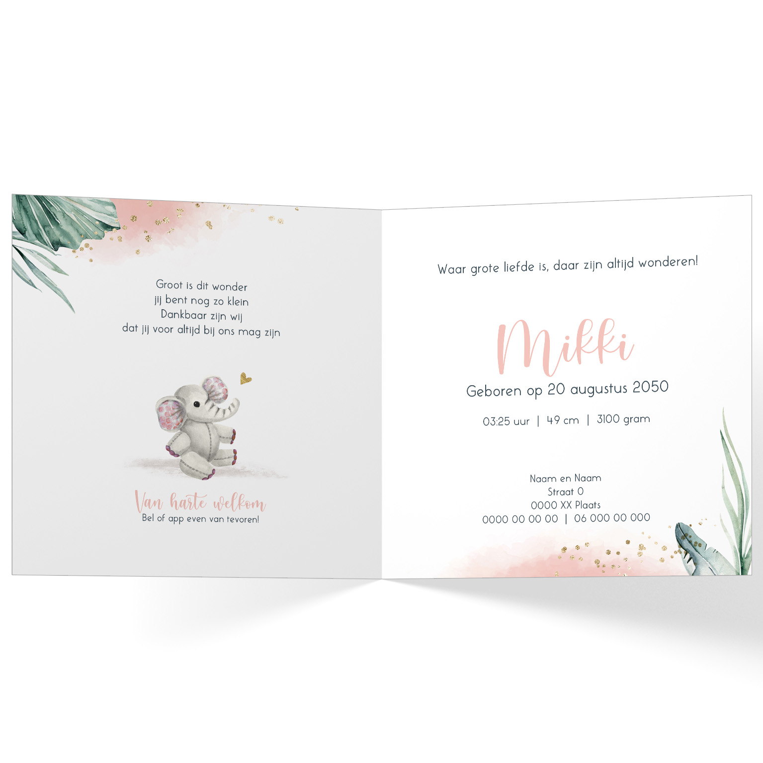 1043-Schattig waterverf dieren geboortekaartje voor een meisje van een lief olifantje met knuffel tussen jungle bladeren en goud confetti op roze aquarel aantal