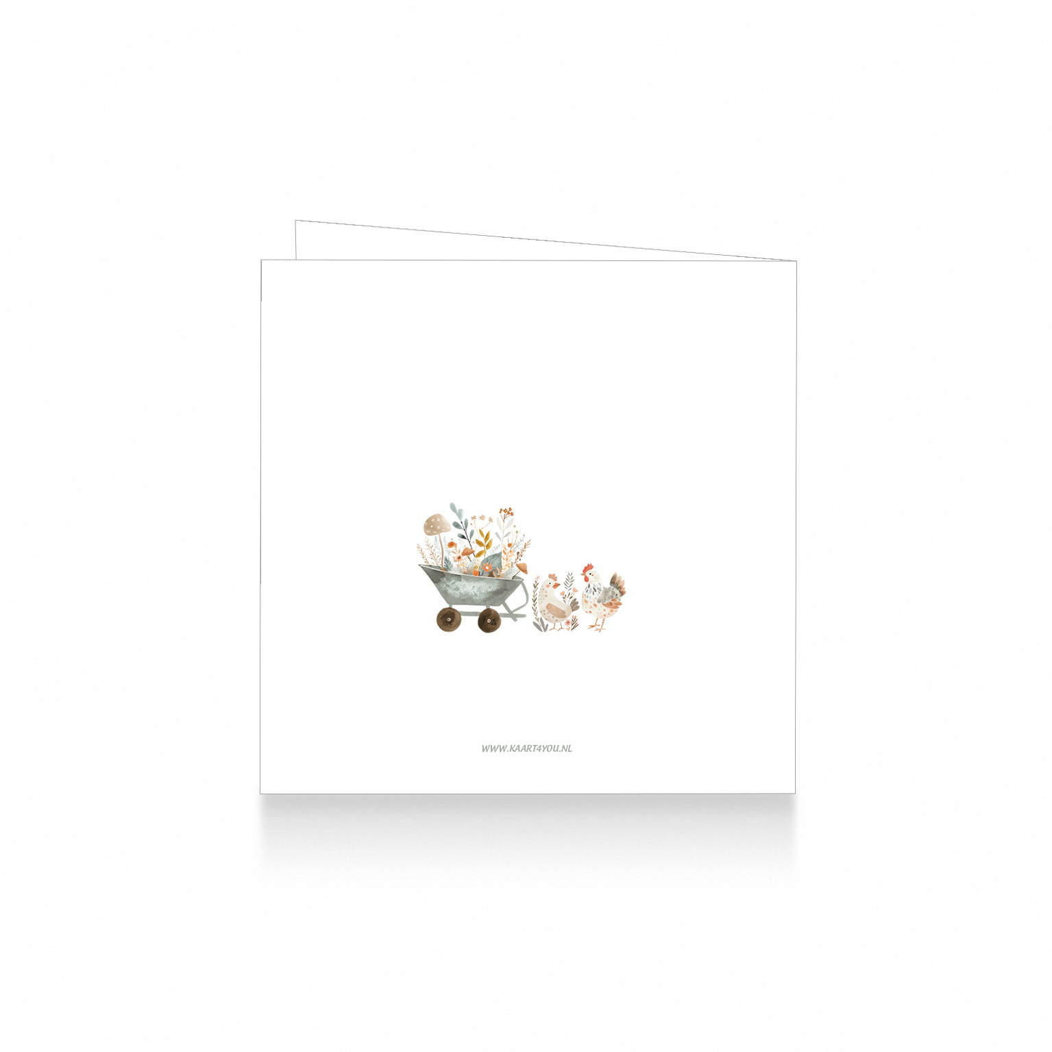 107-Schattig aquarel boerderijdieren geboortekaartje voor een jongen. Op dit lieve kaartje zie je geschilderde dieren zoals een schaapje, varkentje, gans, en kippen bij een huisje met houten hek en boom in waterverf tussen prachtige bloemen en takjes op een witte achtergrond