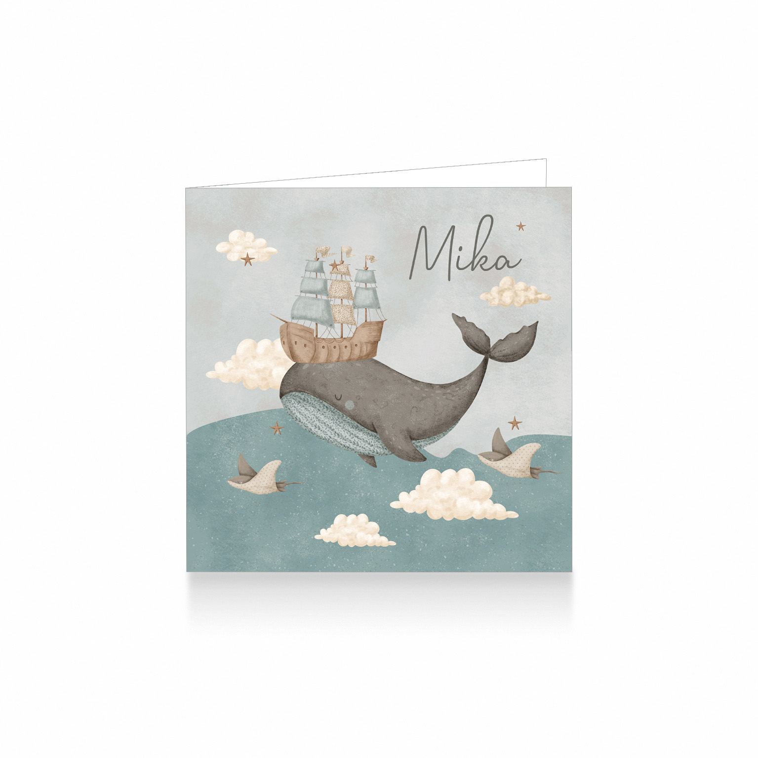 1077-Onder de zee aquarel Ocean geboortekaartje voor een jongen uit de collectie Ocean Dream. Op dit prachtige waterverf kaartje zie je een walvis met een zeilschip tussen wolken, sterren in de zee zwemmen met prachtige manta roggen aantal