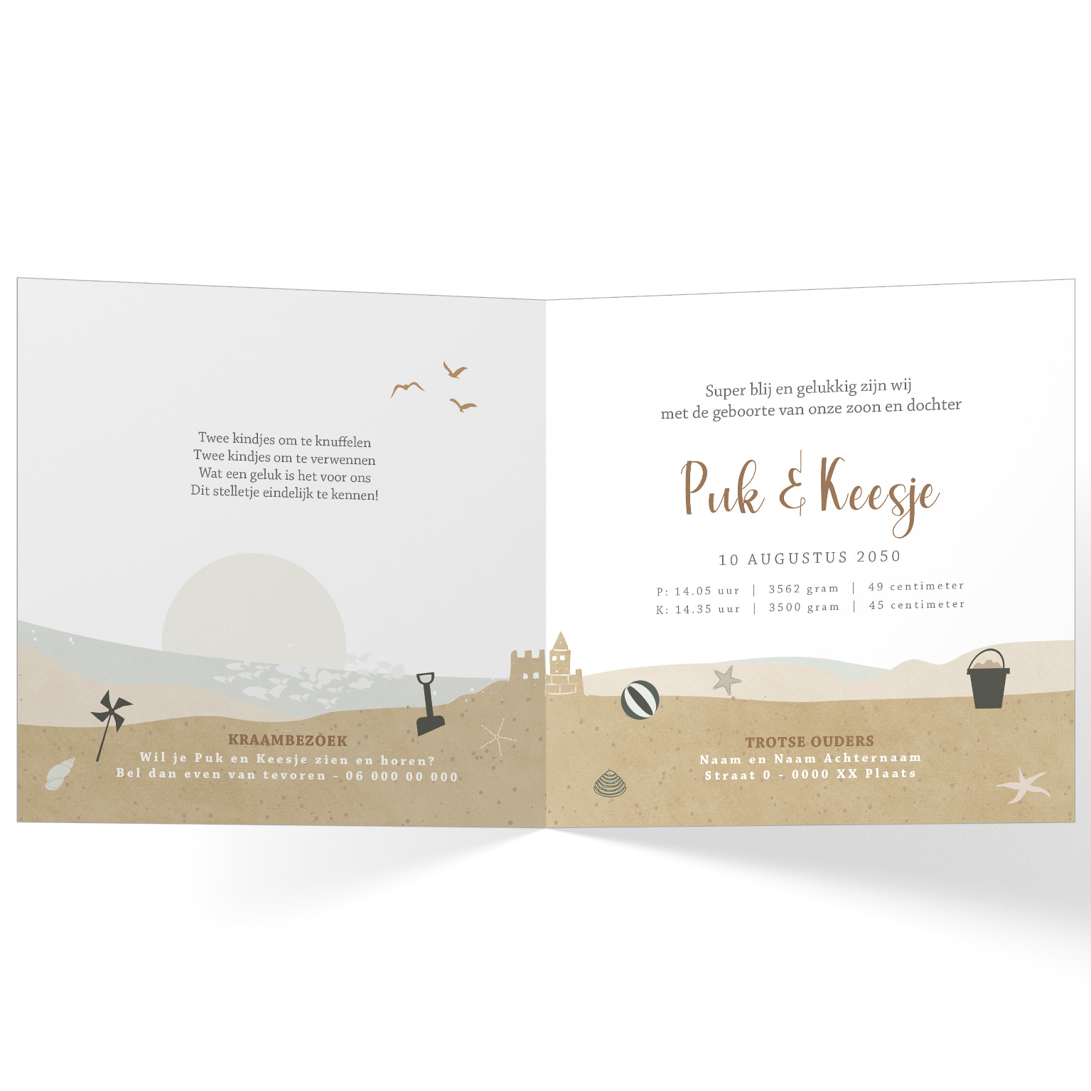 1098-Super leuk strand silhouet geboortekaartje voor een tweeling. Op dit leuke kaartje zie je broer met trekkar vol met strandspullen en zijn zusje loopt daar achter aan. Op de achtergrond zie je een vuurtoren. Het kaartje heeft mooie zand tinten