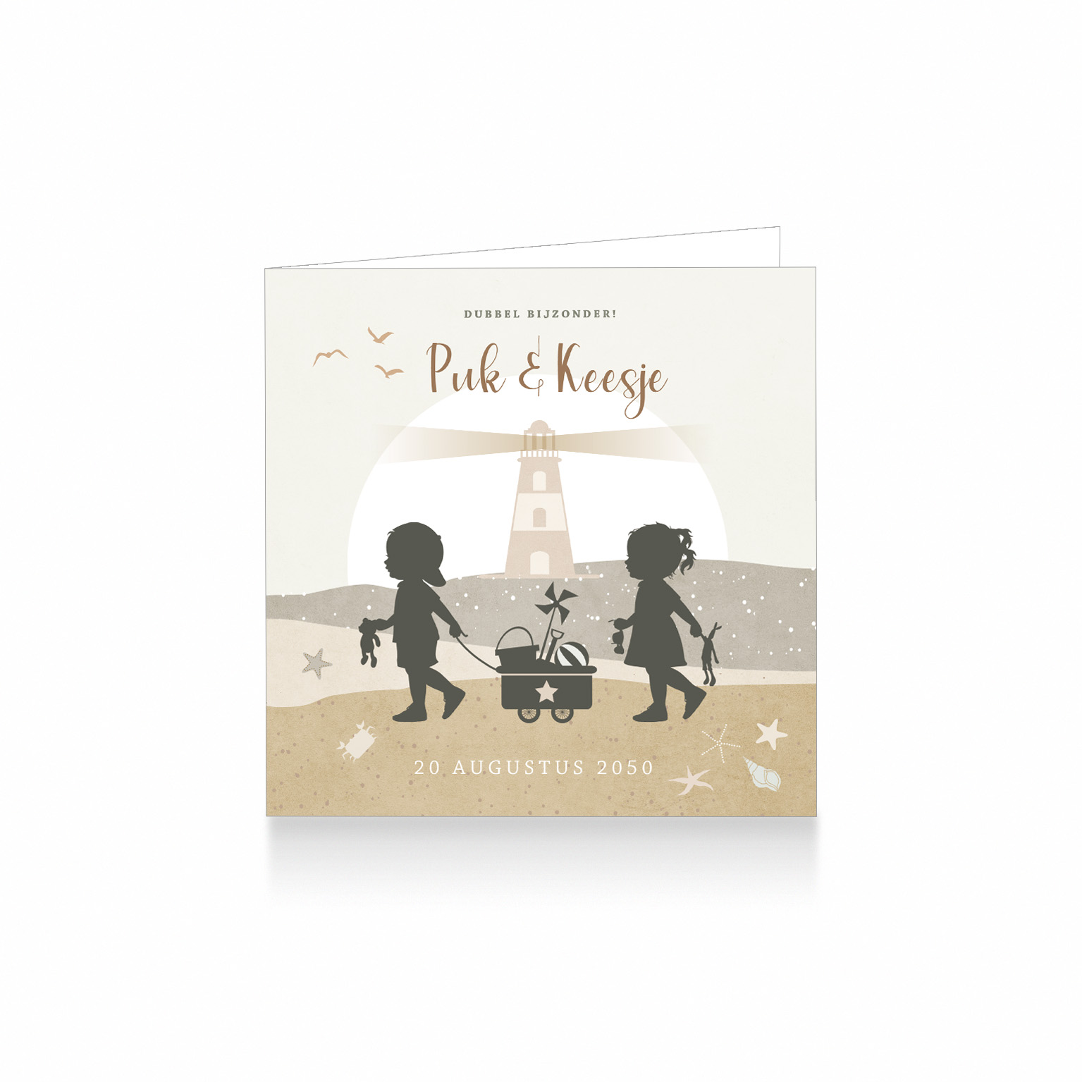 1098-Super leuk strand silhouet geboortekaartje voor een tweeling. Op dit leuke kaartje zie je broer met trekkar vol met strandspullen en zijn zusje loopt daar achter aan. Op de achtergrond zie je een vuurtoren. Het kaartje heeft mooie zand tinten aantal