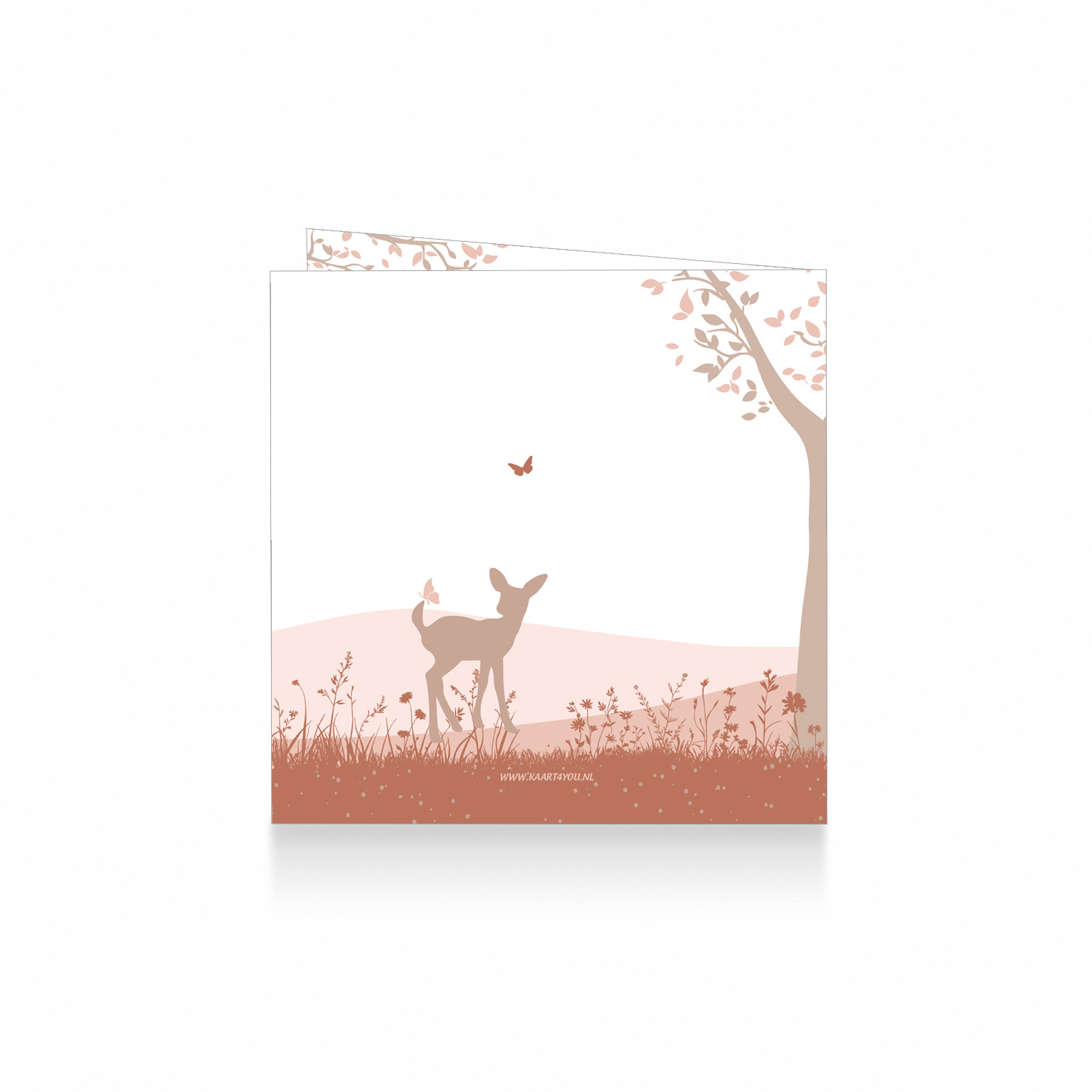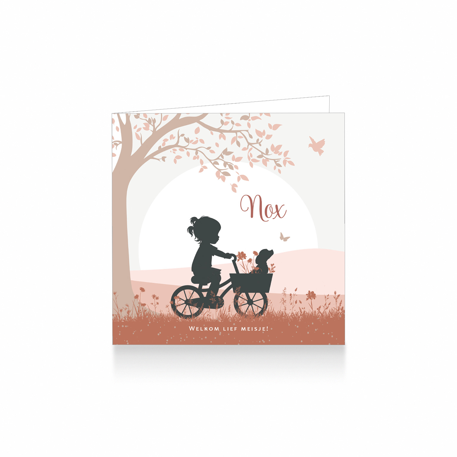 1104-Lief silhouet geboortekaartje voor een meisje. Op dit leuke kaartje zie je een meisje op een bakfiets met haar kleine puppy hondje tussen geplukte bloemetjes in een heuvelachtig landschap met veldbloemen, vlinders, vogel, hertje en een boom.