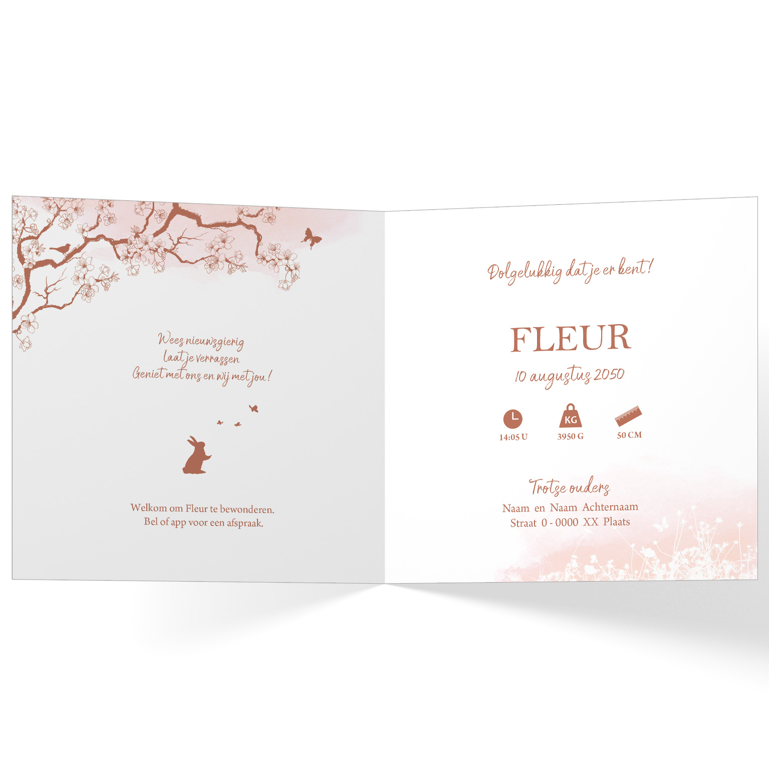 1132-Super leuk silhouet geboortekaartje voor een meisje. Op dit leuke kaartje zie je een meisje op een schommel die onder een prachtige boom met bloemen hangt op een roze kleurig aquarel achtergrond aantal