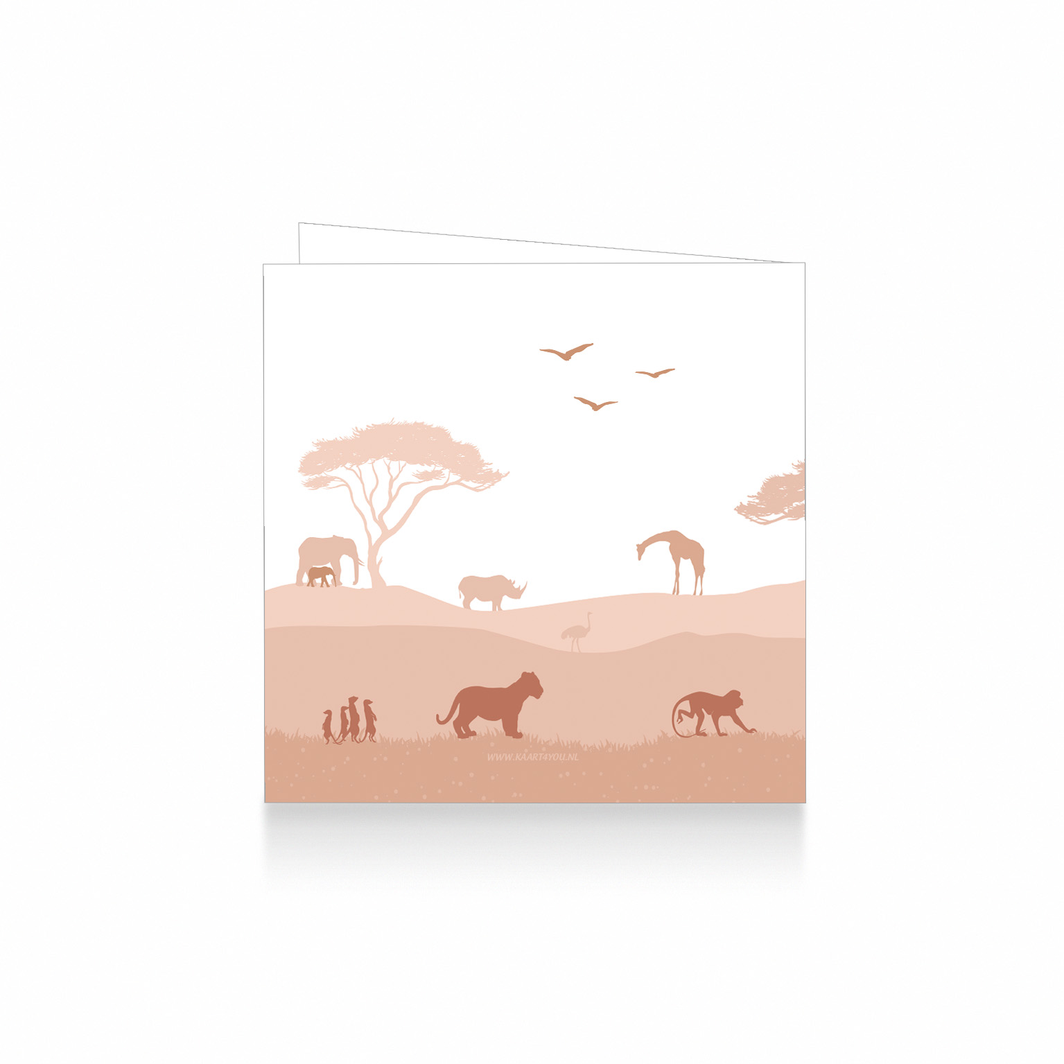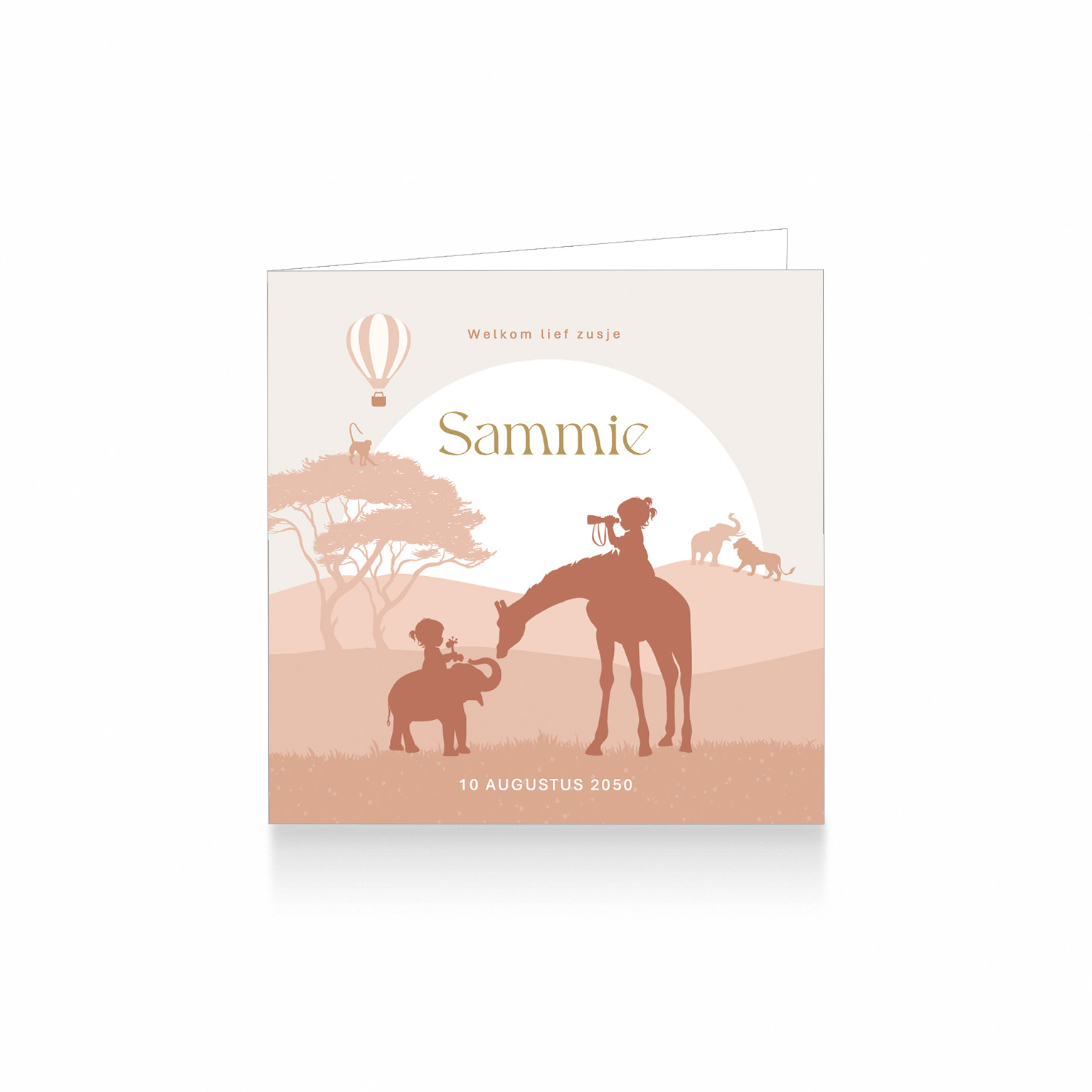1134-Lief safari silhouet geboortekaartje voor een tweede kindje, een meisje. Op dit kaartje zie je een grote zus met verrekijker op een giraf en kleine zus op een olifantje, verder zie je andere safaridieren zoals een aapje, stokstaartjes en een leeuwtje in een prachtig savanne landschap met een luchtballon op de achtergrond. Het kaartje is in alle kleuren aan te passen.