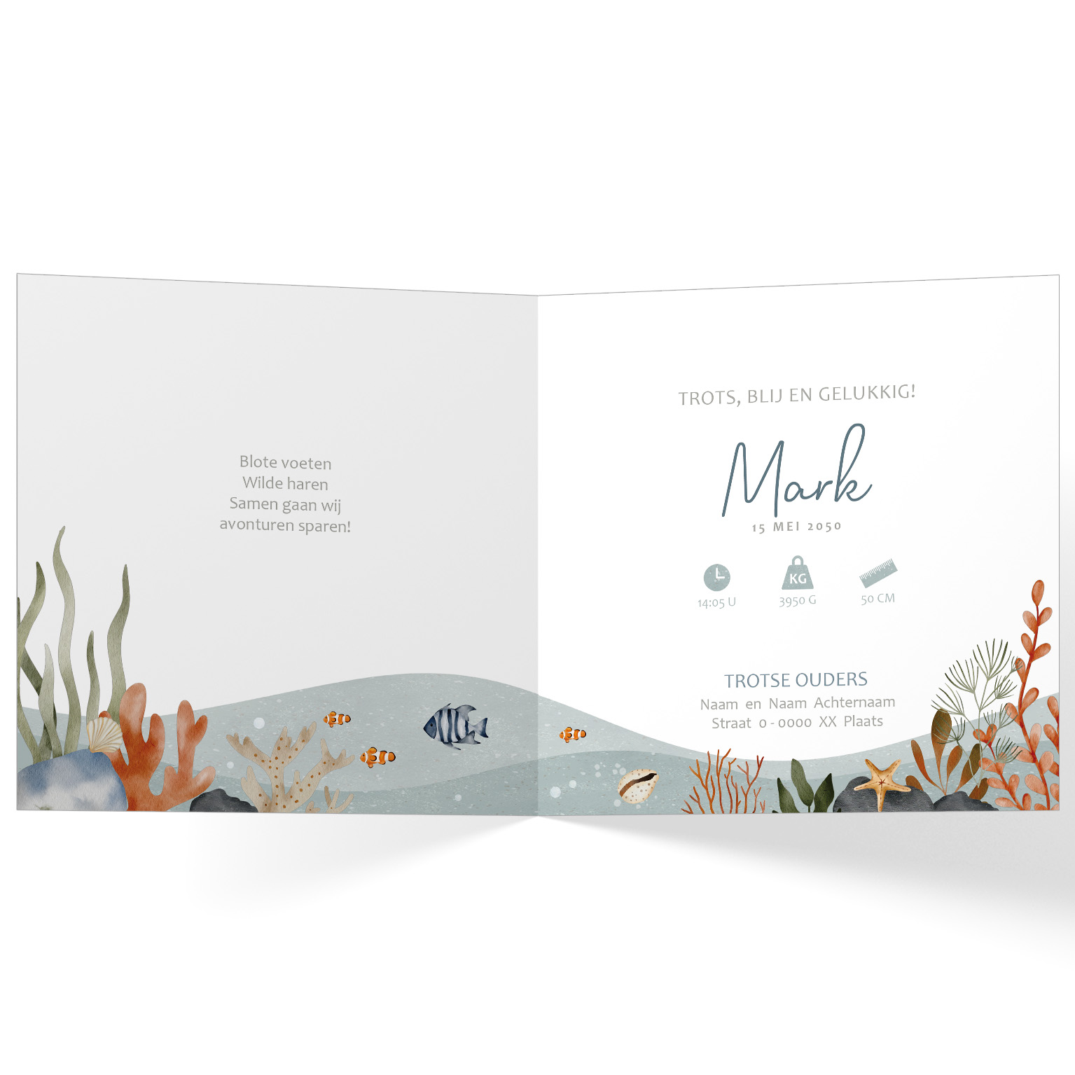 1151-Onder de zee aquarel Oceaan dieren geboortekaartje voor een jongen uit de collectie Ocean Dream. Op dit prachtige waterverf kaartje zie je een moeder walvis zwemmen met haar kalf in zee tussen koraal en andere zeedieren.