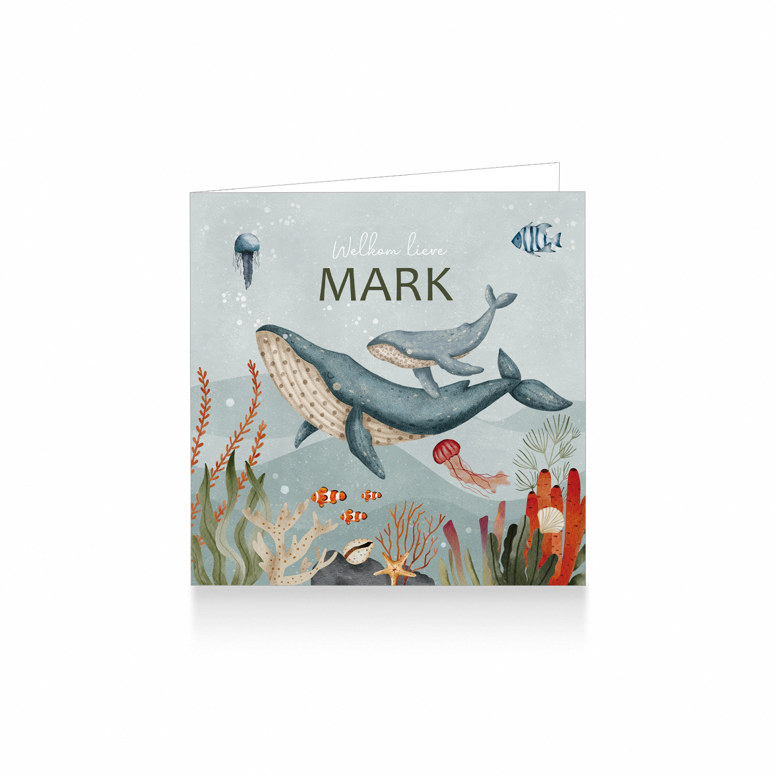 1151-Onder de zee aquarel Oceaan dieren geboortekaartje voor een jongen uit de collectie Ocean Dream. Op dit prachtige waterverf kaartje zie je een moeder walvis zwemmen met haar kalf in zee tussen koraal en andere zeedieren. aantal