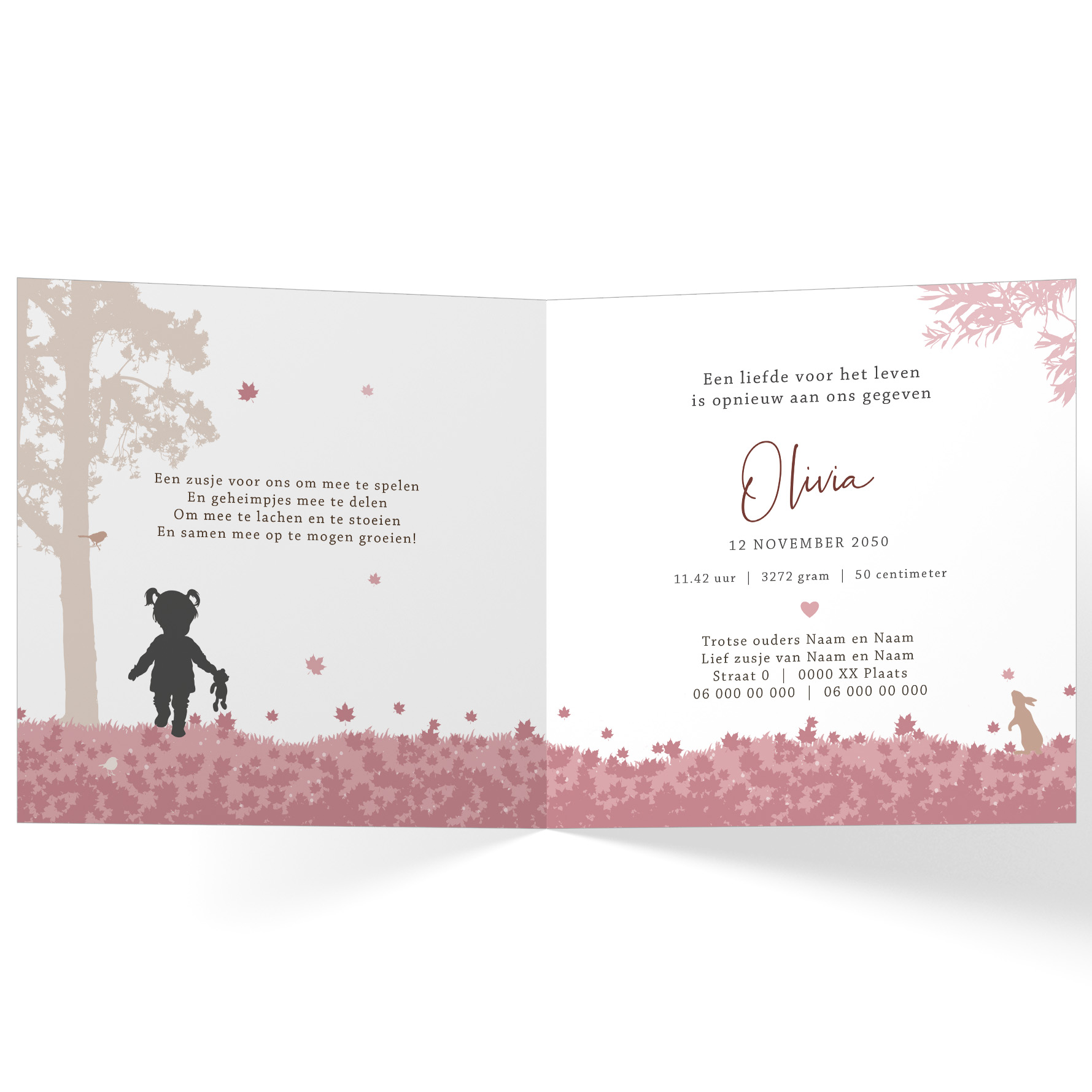 1182-Vrolijk herfst silhouet geboortekaartje voor een derde kindje, een meisje. Op dit kaartje zie je grote zus en broertje hand in hand met hun kleine zusje in een bos met herfst blaadjes, hertje en konijntje.