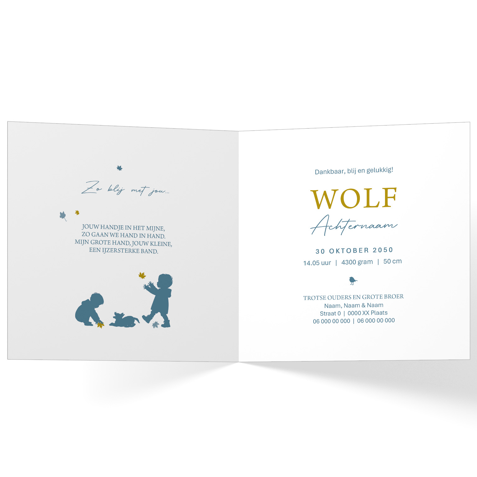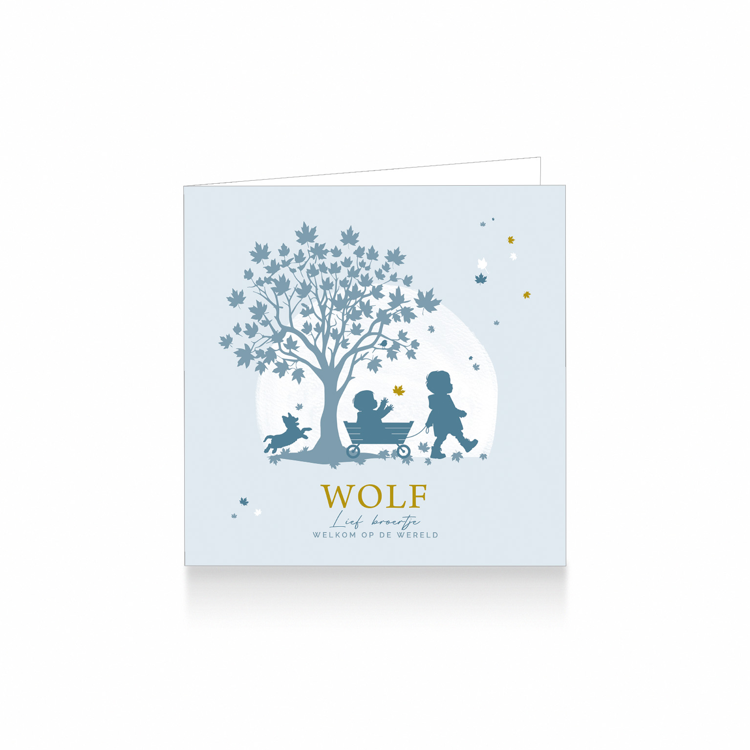 1183-Hip herfst silhouet geboortekaartje voor een tweede kindje, een jongen. Op dit lieve kaartje zie je grote broer samen met zijn kleine broertje in bolderkar en hun hondje, onder een prachtige boom op een blauwe achtergrond met dwarrelende herfst blaadjes en wit aquarel.