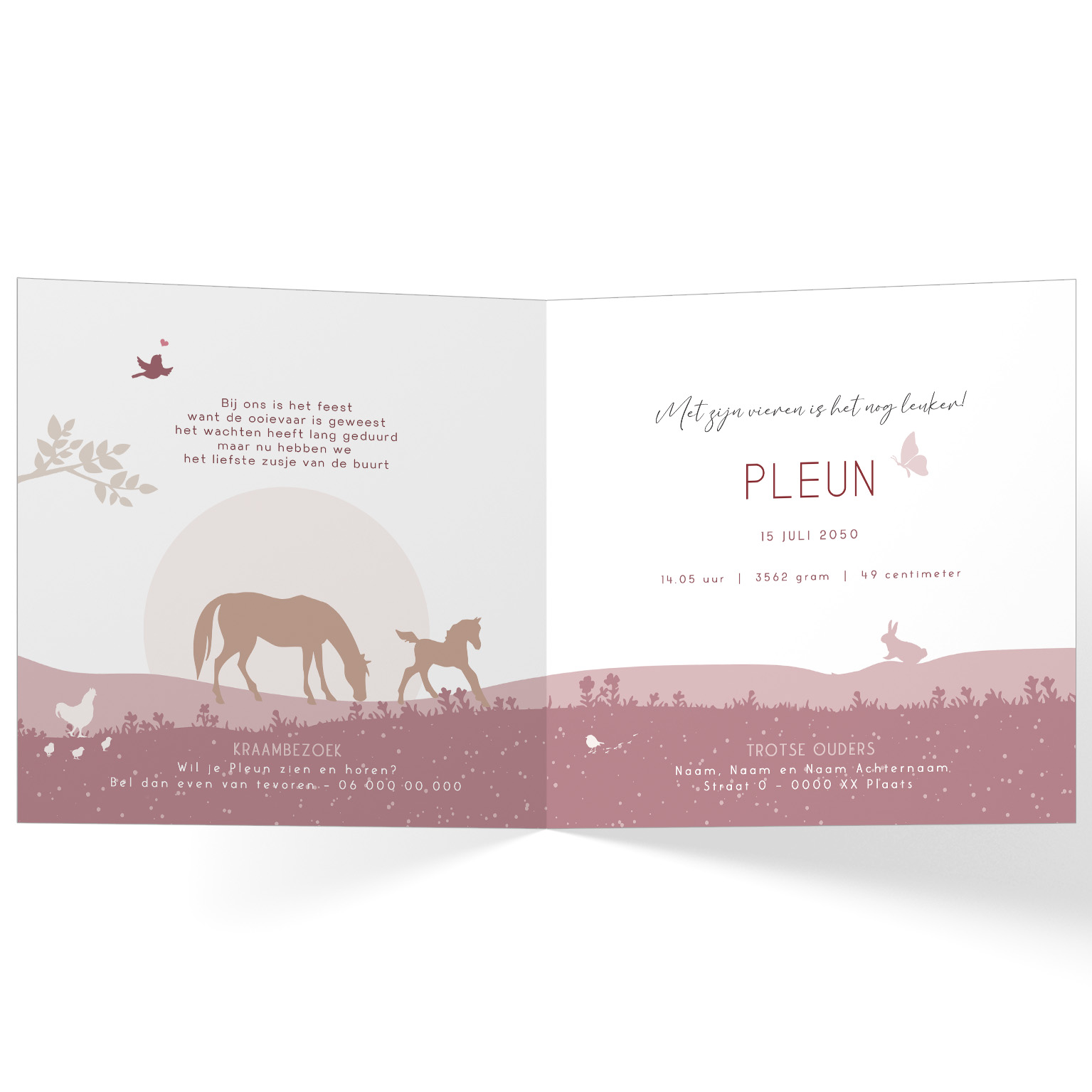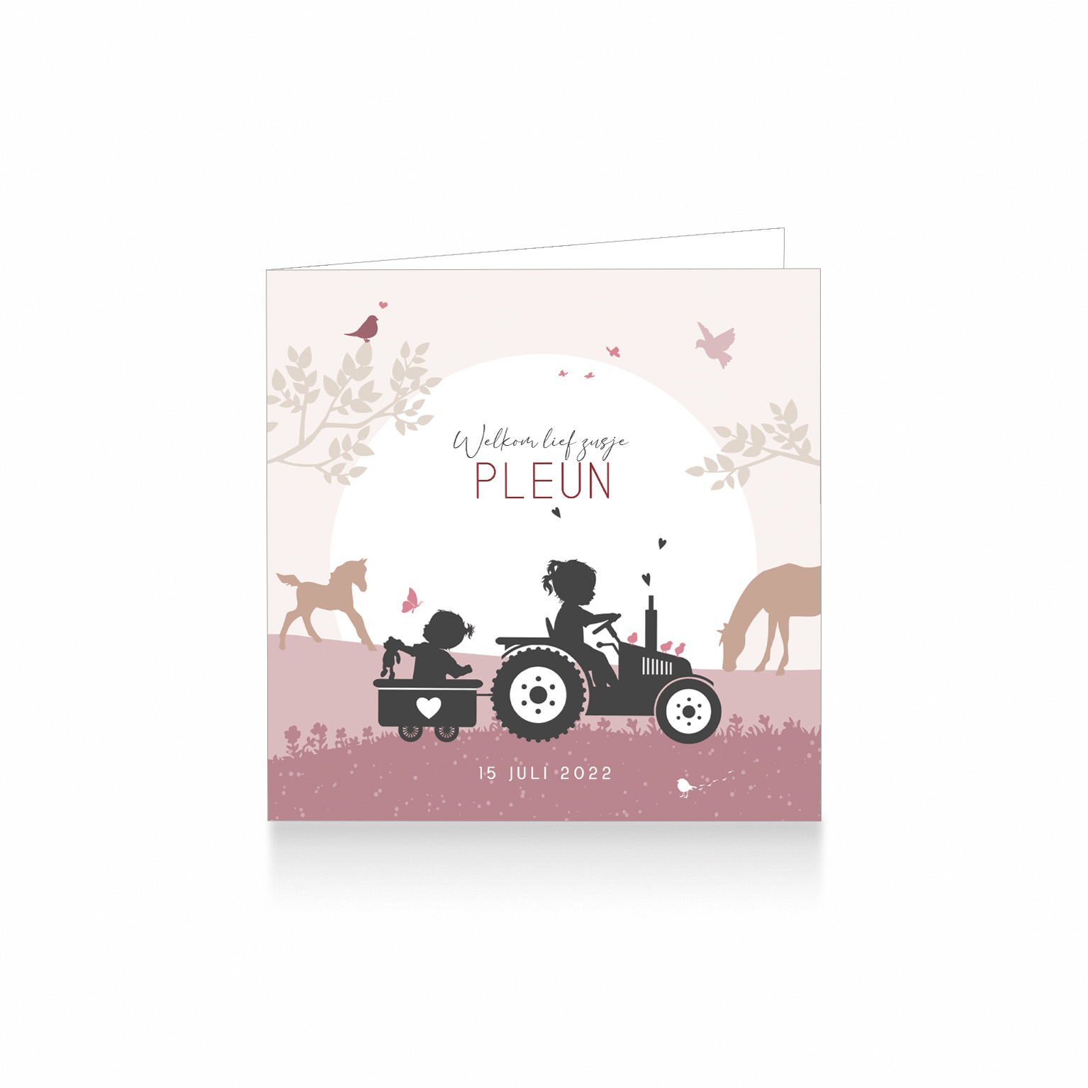 1205-Super leuk silhouet geboortekaartje voor een tweede kindje, een meisje. Op dit leuke kaartje zie je grote zus op een tractor met kuikentjes met een aanhangwagentje met daarin haar kleine baby zusje, in een landschap met paarden, bloemetjes, vlinders en vogeltjes.