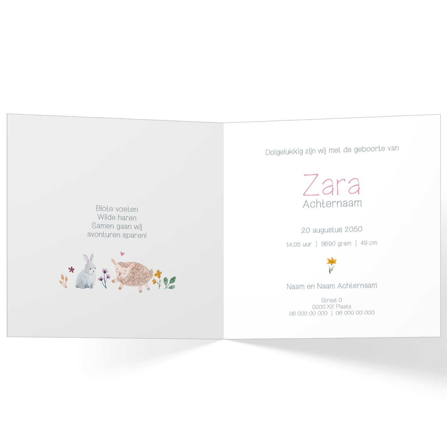 1282-Super lief waterverf bosdieren geboortekaartje voor een meisje met dieren in een krans waaronder een vos, konijn, uil, egel en schaap tussen blaadjes en bloemen aantal