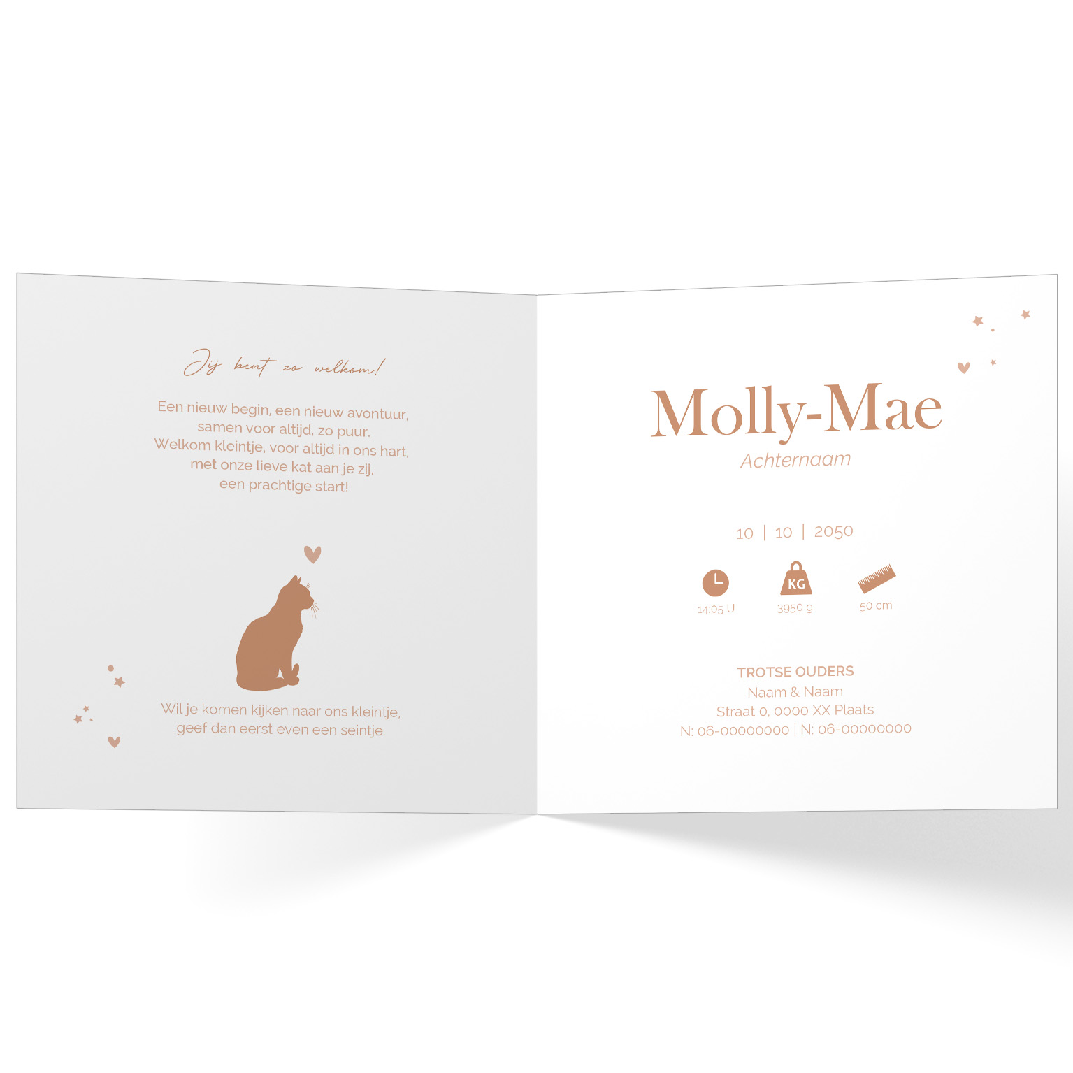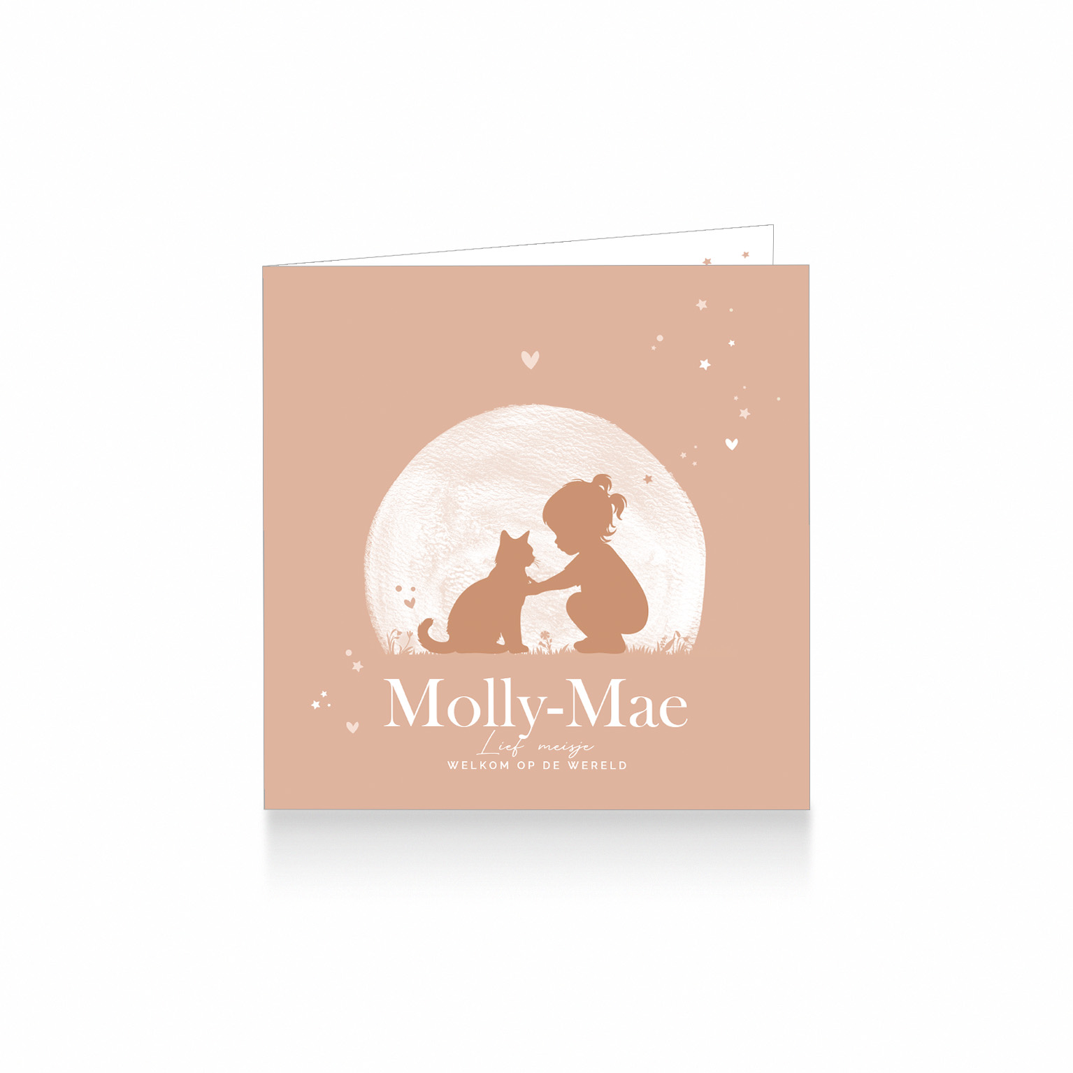 1284-Lief silhouet geboortekaartje voor een meisje. Op dit kaartje zie je een schattig meisje haar kat aaien op een terra kleurige achtergrond met wit aquarel, hartjes en sterren.