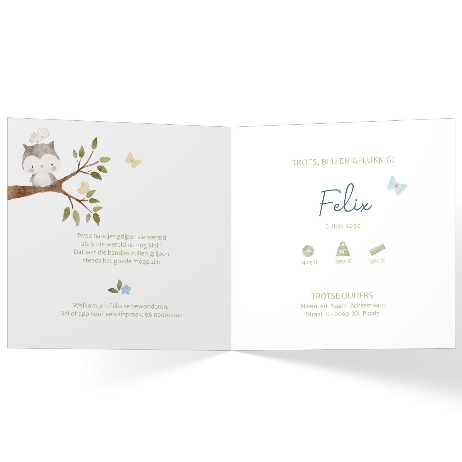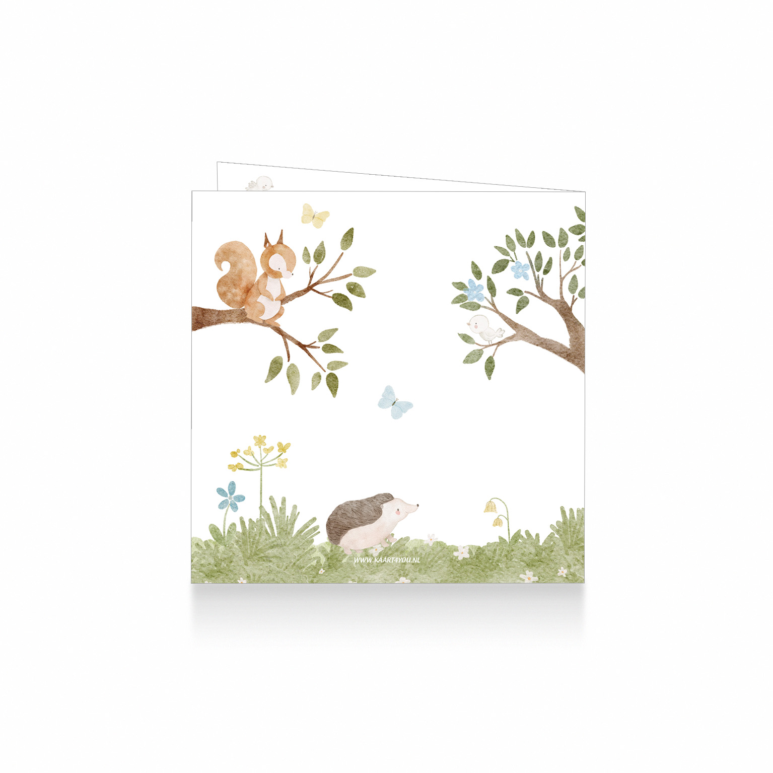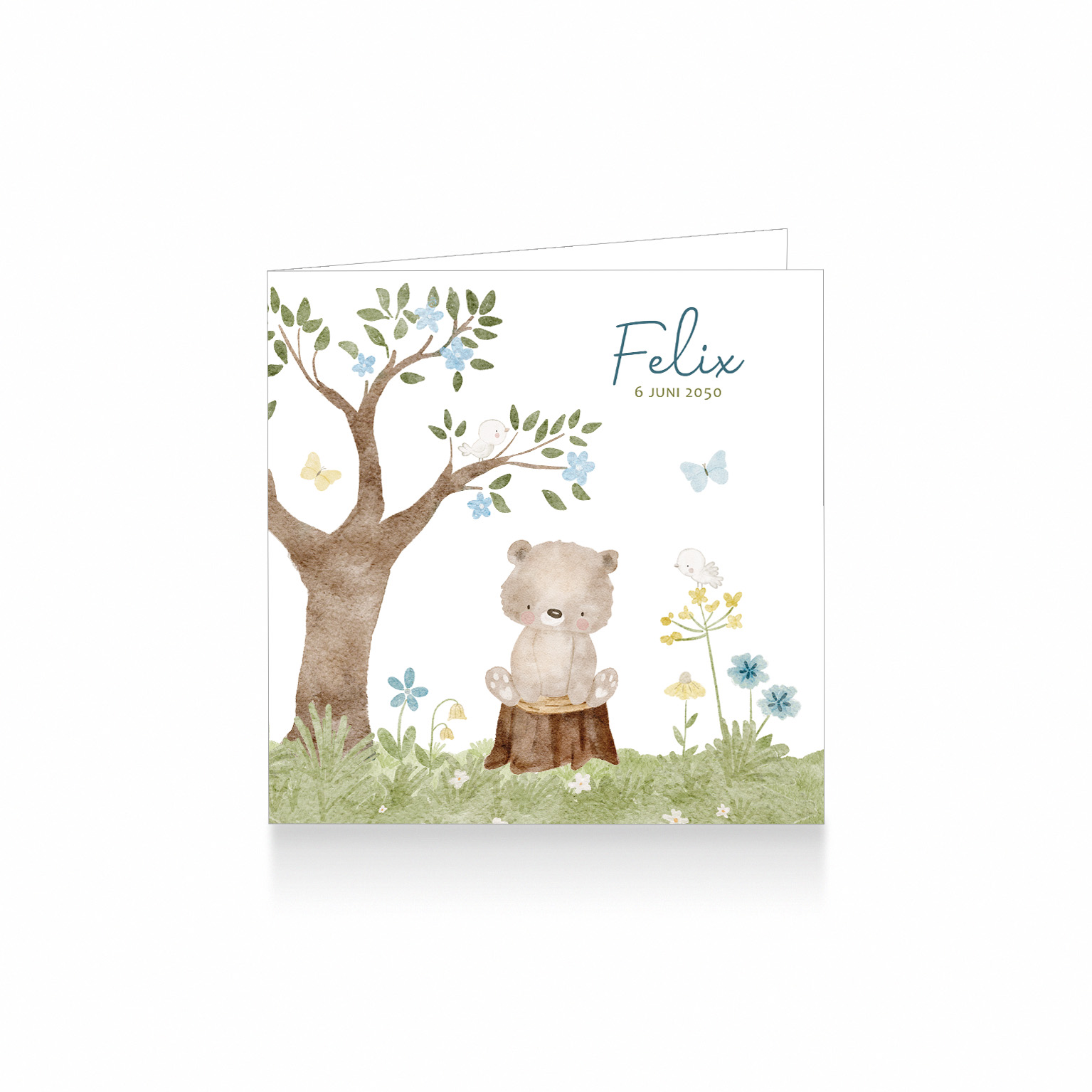 1287-Schattig waterverf bosdieren geboortekaartje voor een jongen met een lief beertje op een boomstronk. In het gras zie je prachtige bloemen en op de achtergrond een mooie boom met bloemen, vlinders en vogeltje. aantal
