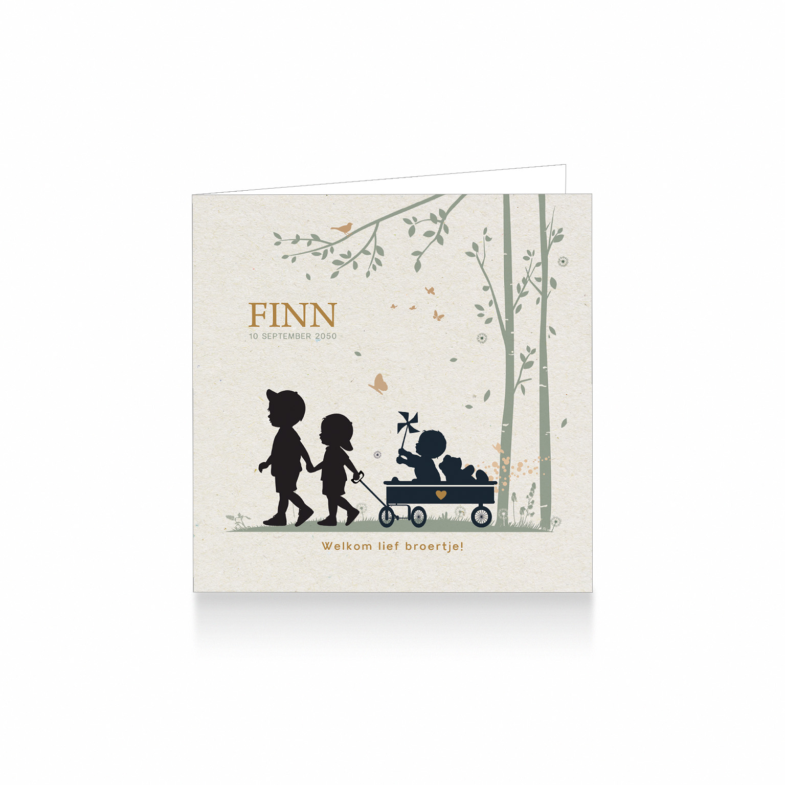 1391-Super leuk silhouet geboortekaartje voor een derde kindje, een jongen. Op dit kaartje zie je broers hand in hand wandelen met een bolderkar met hun kleine baby broertje die speelt met een windmolen in het bos op een kraft karton achtergrond