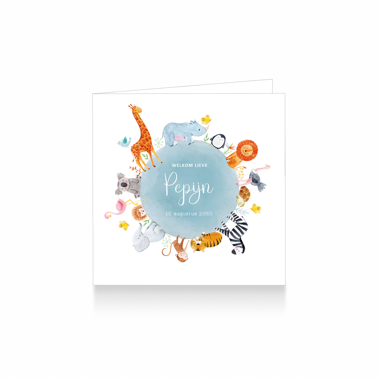 1425-Super leuk waterverf geboortekaartje voor een jongen met geschilderde safari dieren zoals een giraf, neushoorn, leeuw, struisvogel, schildpad, zebra, tijger, aapje, olifant, stekelvarken, flamingo, koala beertje, vogel en vlinders op een blauw aquarel wereldbol