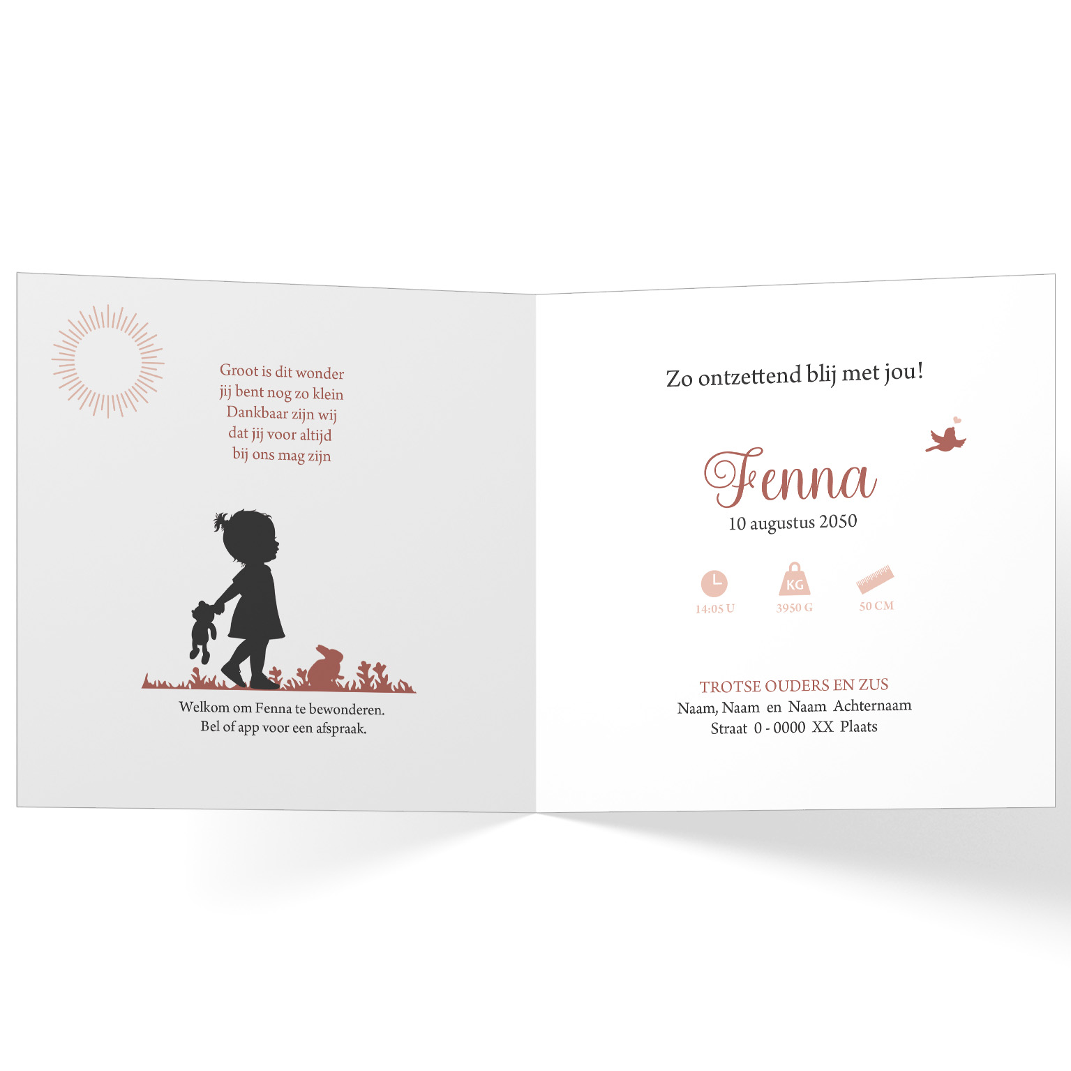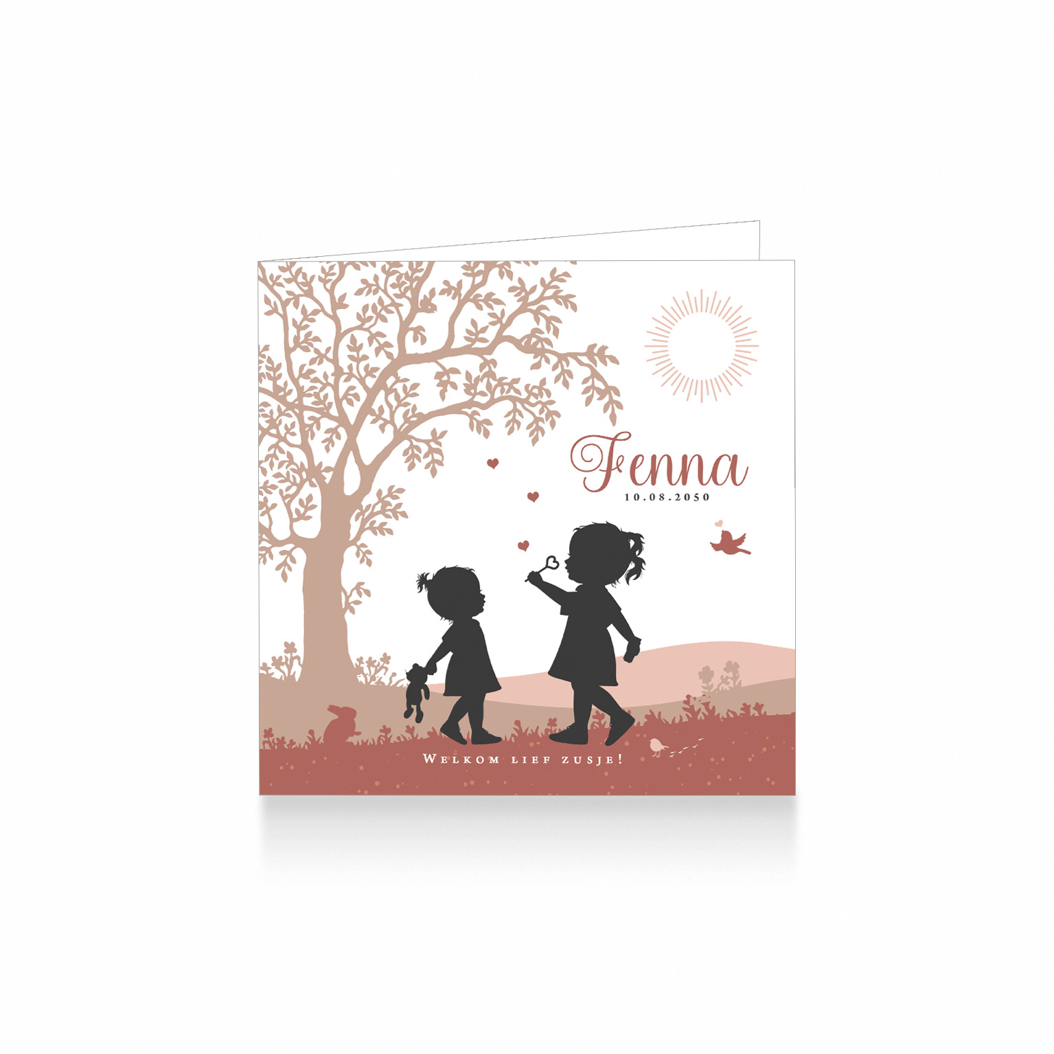 1426-Lief silhouet geboortekaartje voor een tweede kindje, een meisje. Op dit kaartje zie je grote zus die met een bellenblaas hartjes blaast en haar kleine zusje kijkt verwonderd toe, onder een boom tussen bloemetjes, vlinders, konijntje en vogeltje.