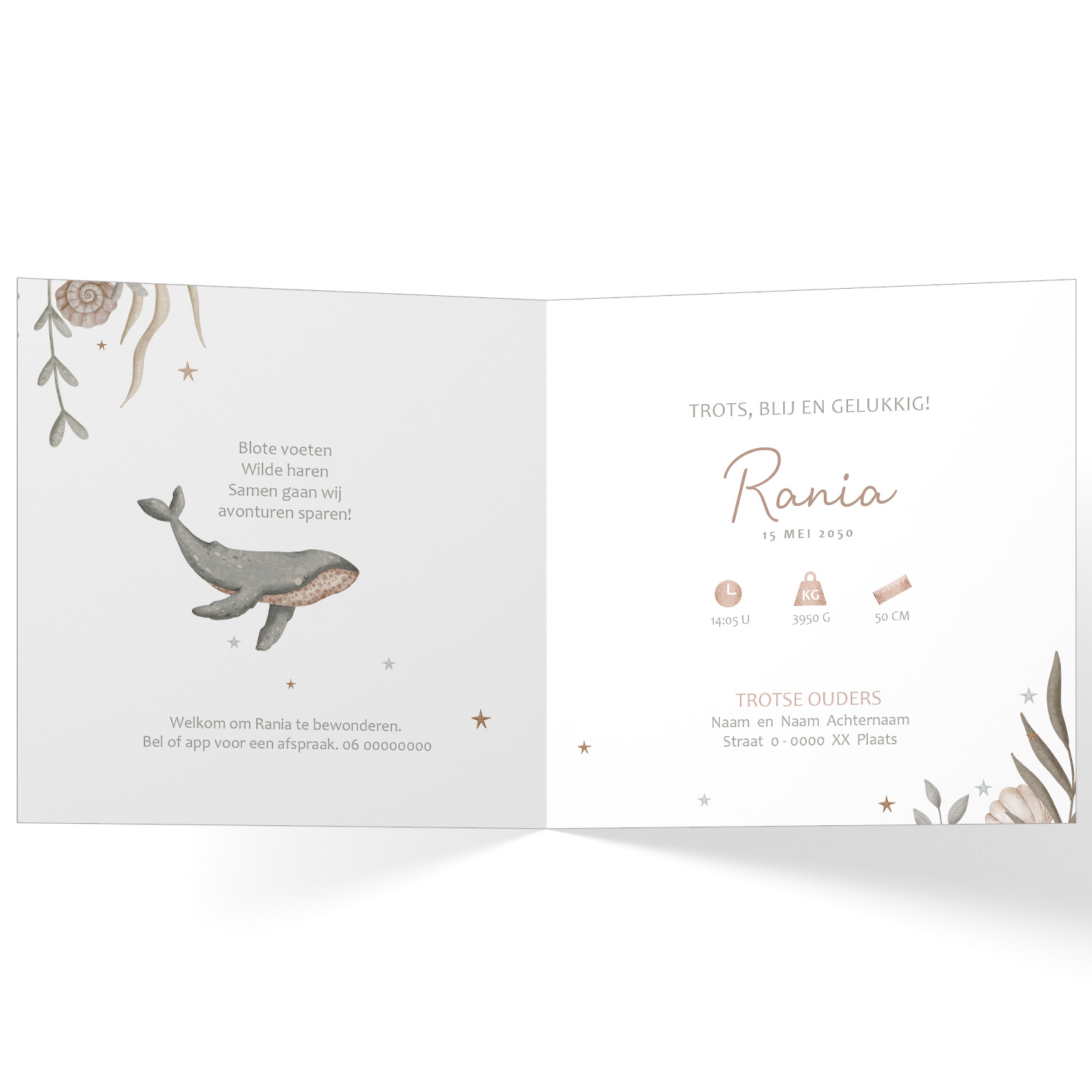 1480-Onder de zee aquarel Oceaan dieren geboortekaartje voor een meisje uit de collectie Ocean Dream. Op dit prachtige waterverf kaartje zie je een moeder walvis zwemmen met haar kalf in zee met koraal. aantal