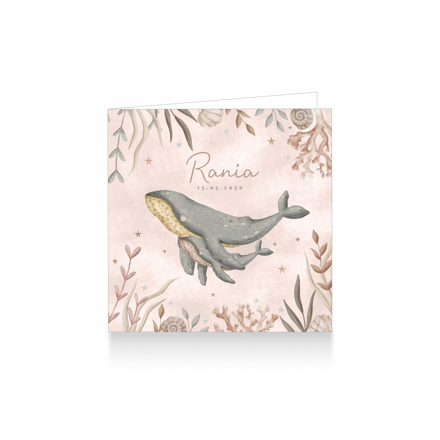 1480-Onder de zee aquarel Oceaan dieren geboortekaartje voor een meisje uit de collectie Ocean Dream. Op dit prachtige waterverf kaartje zie je een moeder walvis zwemmen met haar kalf in zee met koraal.