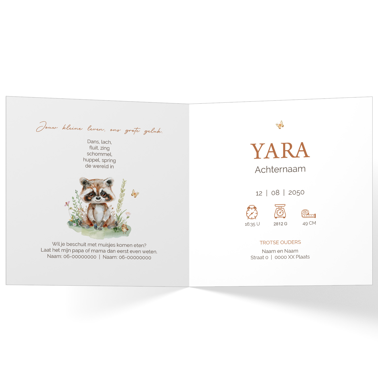 1561-Schattig aquarel bosdieren geboortekaartje voor een jongen of meisje. Op dit lieve kaartje zie je een schattig wasbeertje bij een boomhuisje met vogeltjes en vlinders, bloemen en takjes in waterverf op een kraft karton achtergrond. aantal