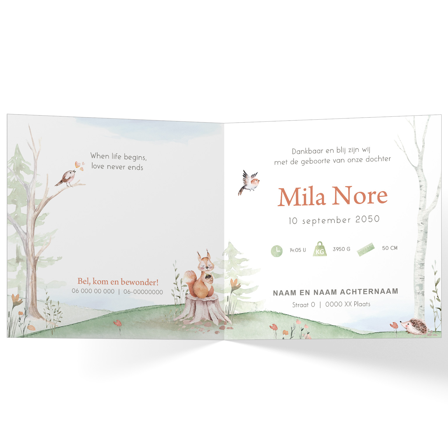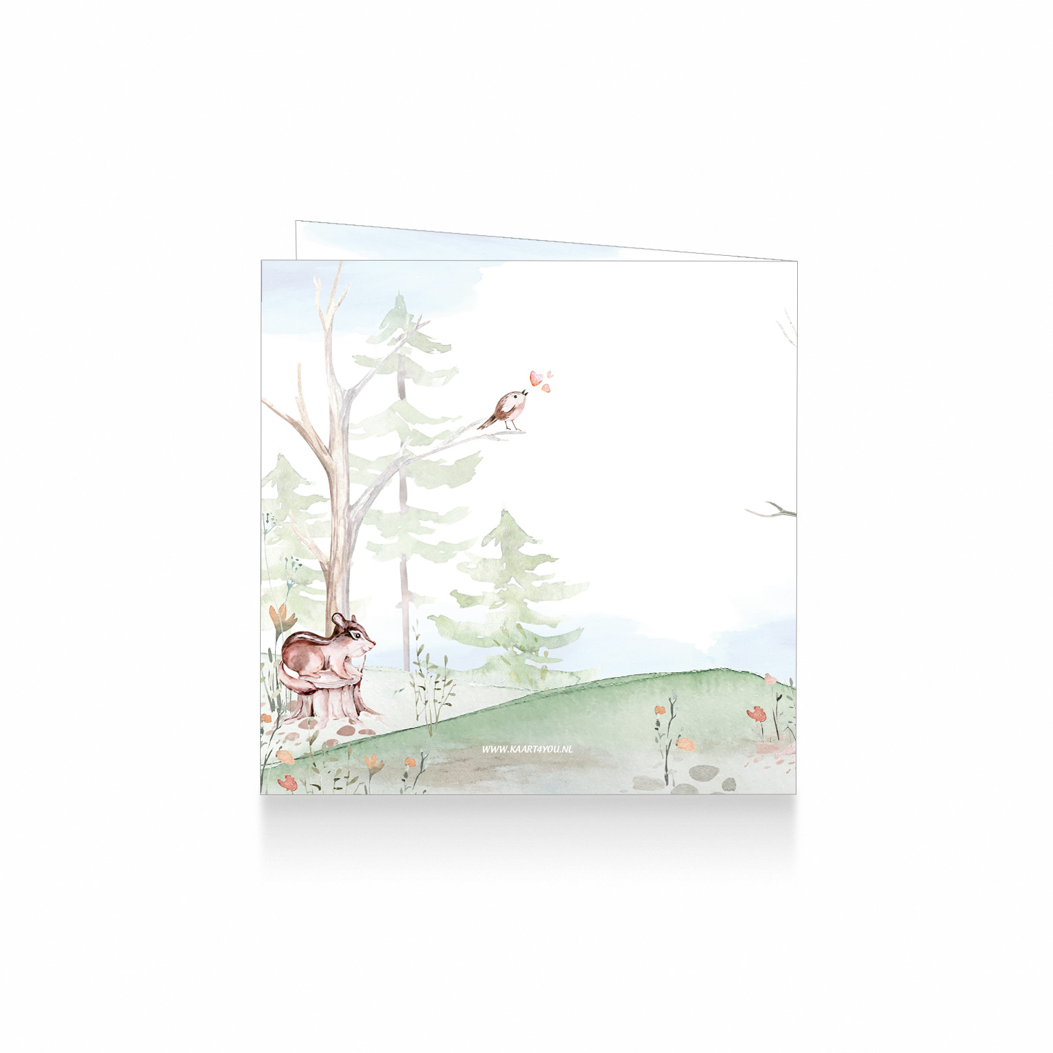 1658-Lief waterverf bosdieren geboortekaartje voor een meisje met een beertje met bloem, vos, konijntje, uil en vogeltjes in het bos. aantal