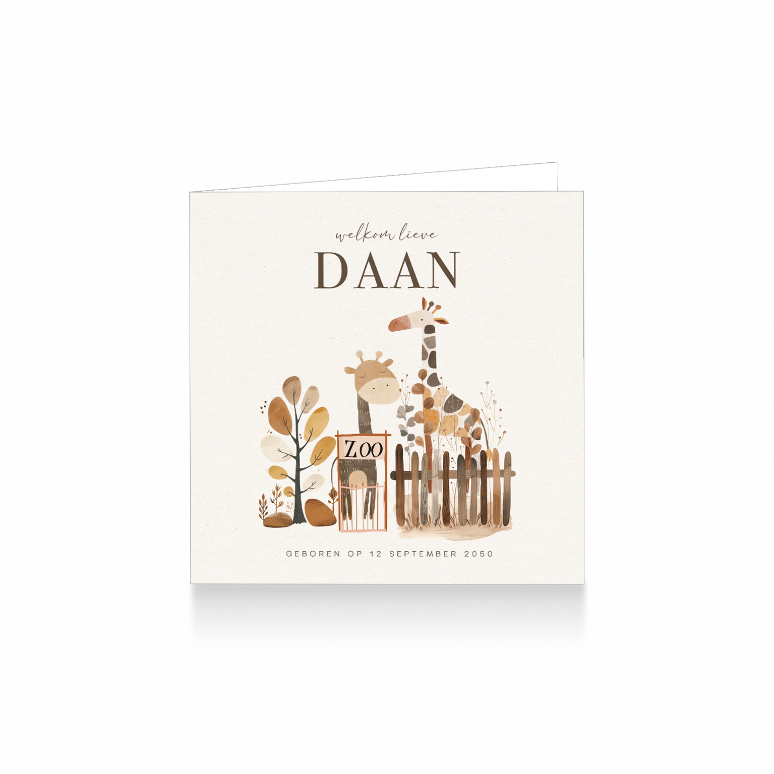 1676-Aquarel jungle dieren geboortekaartje voor een jongen. Op dit leuke kaartje zie je geschilderde giraffen in waterverf in een zoo op een kraft karton achtergrond.