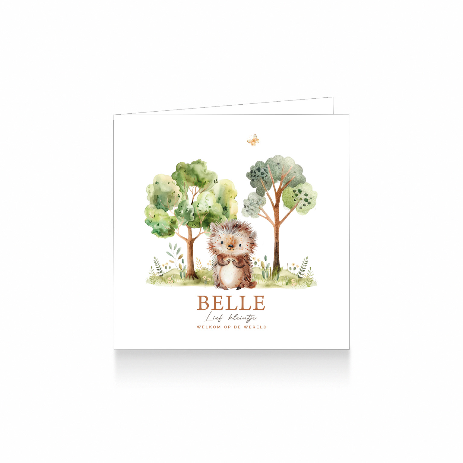 1729-Schattig aquarel bosdieren geboortekaartje voor een jongen of meisje. Op dit lieve kaartje zie je een schattig egeltje tussen veldbloemen, takjes, vlinder en prachtige bomen in waterverf op een witte achtergrond.