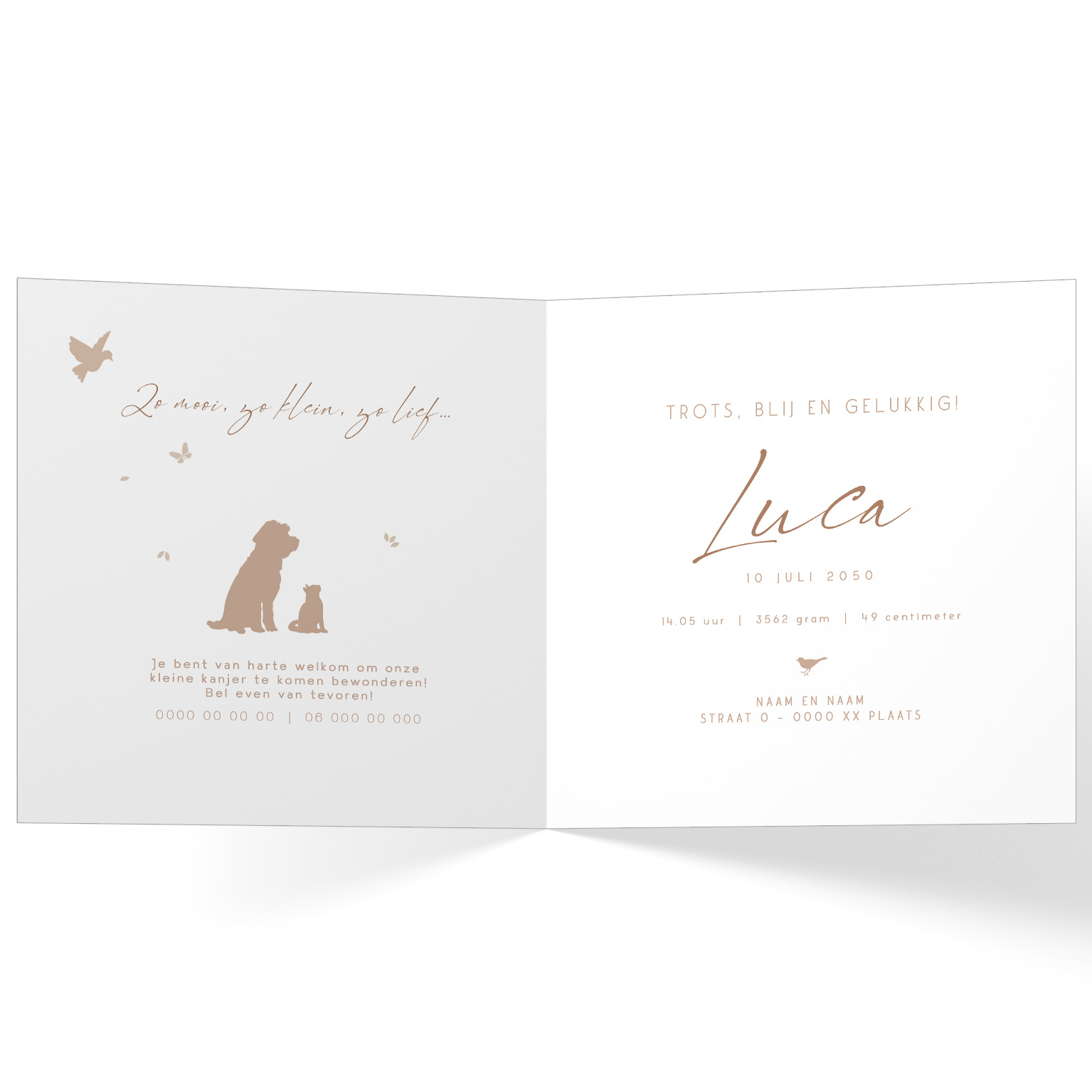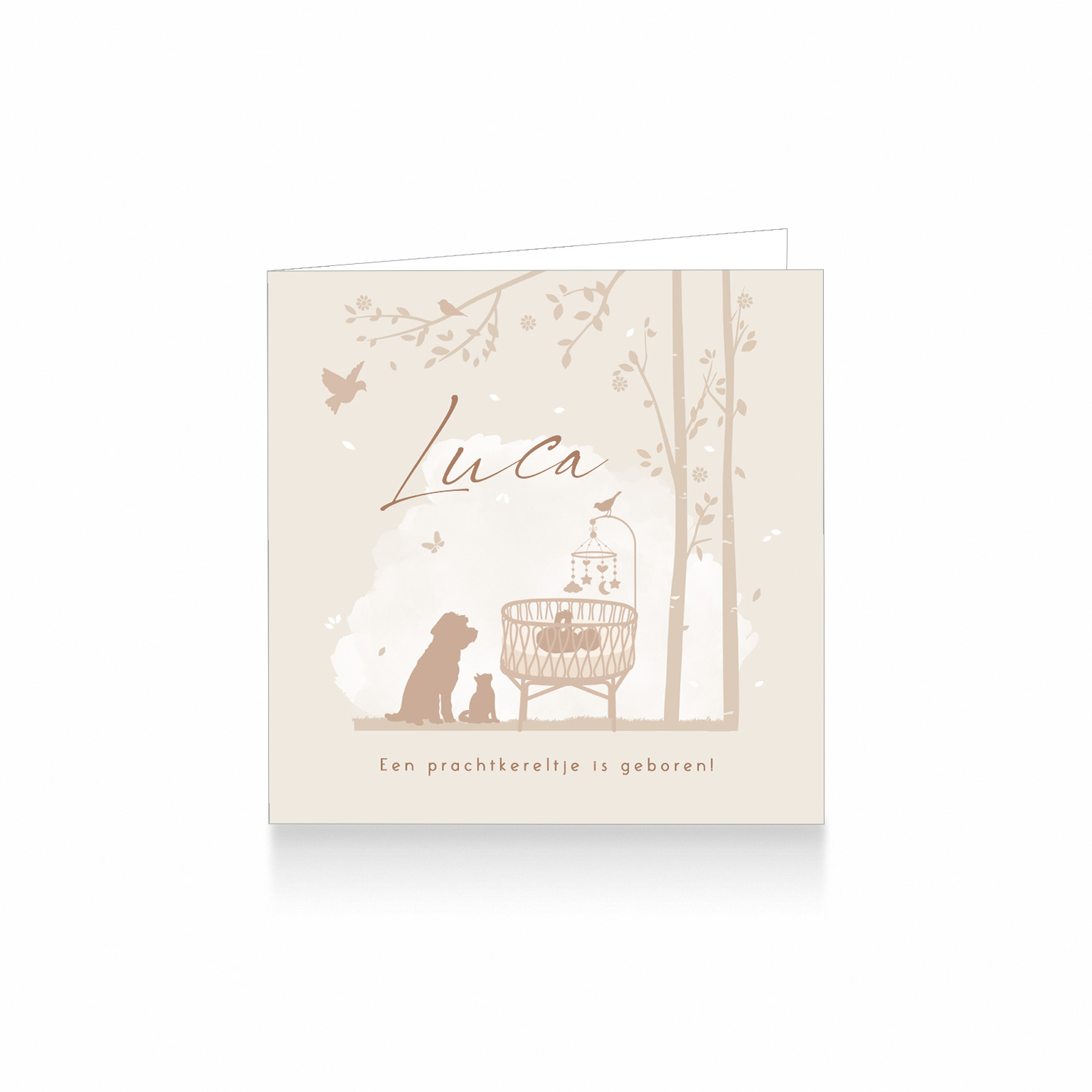 1737-Trendy silhouet geboortekaartje voor een jongen. Op dit schattige kaartje zie je een rotan ledikantje met een baby jongetje en zijn huisdier vriendjes, een hond en een kat, die naar hem kijken in een bos met prachtige bomen. Het kaartje is in beige tinten met wit aquarel.