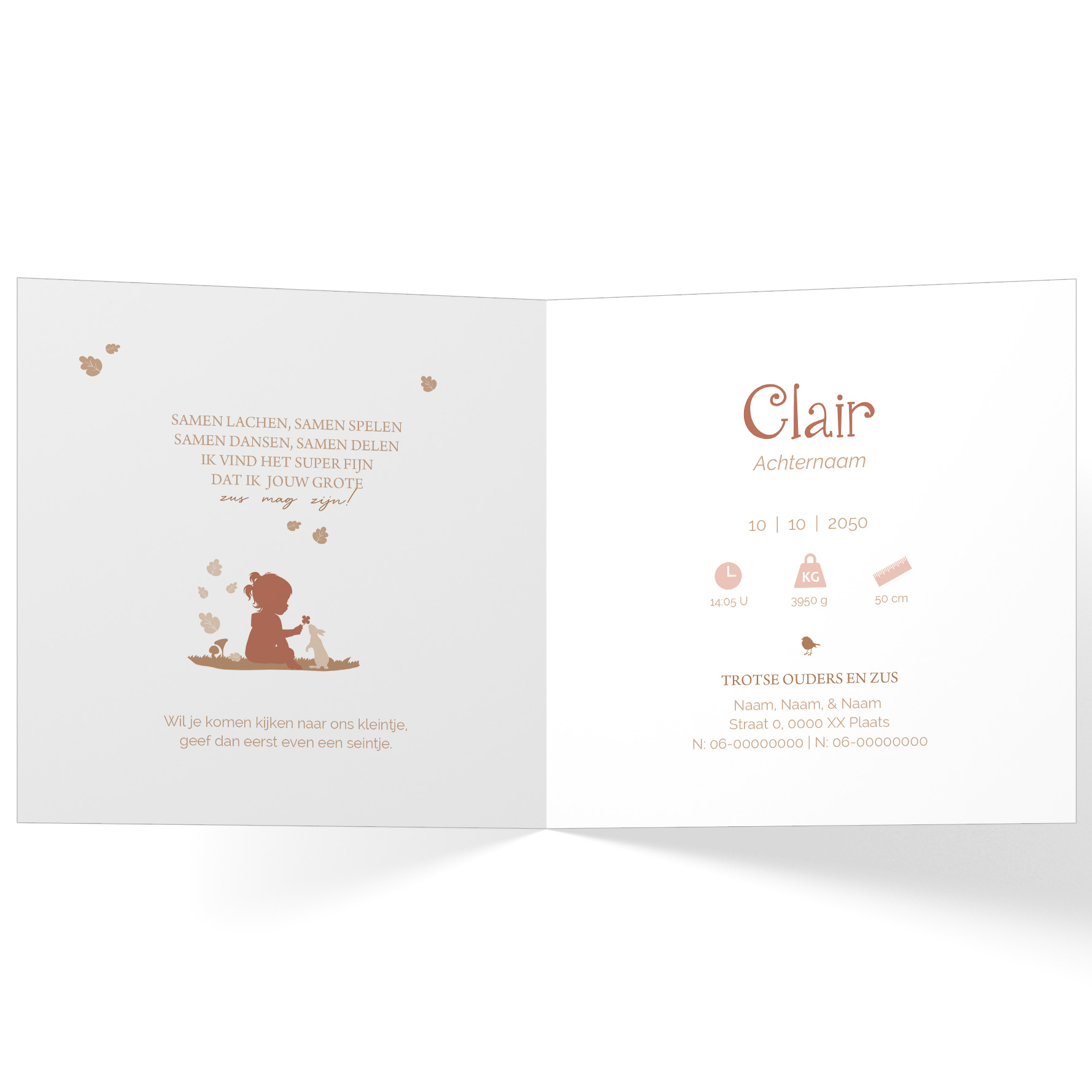 1742-Vrolijk herfst silhouet geboortekaartje voor een tweede kindje, een meisje. Op dit lieve kaartje zie je grote zus samen met haar kleine zusje spelen met herfstblaadjes op een zalmroze achtergrond met wolken en fladderende blaadjes.