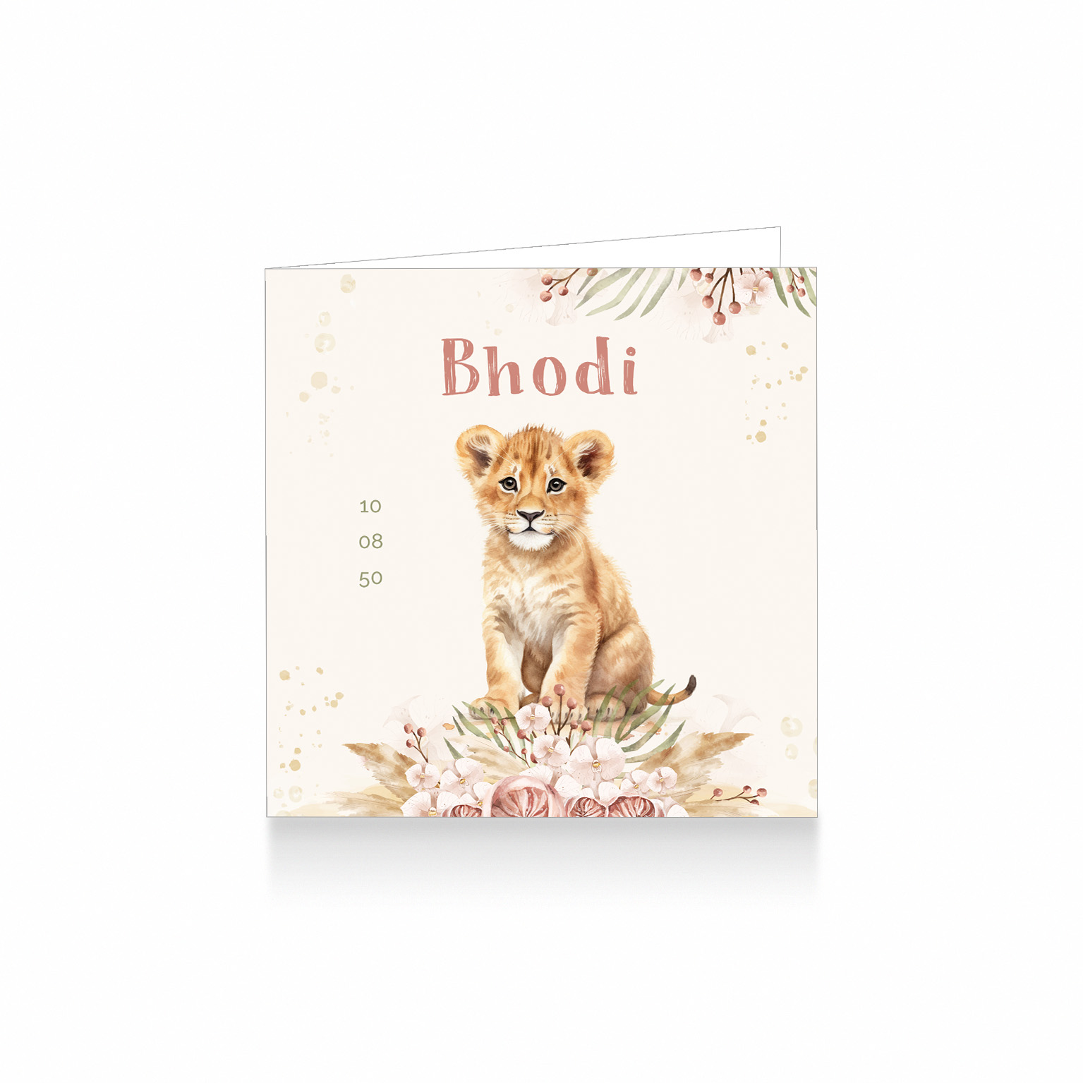 1754-Super lief boho stijl waterverf dieren geboortekaartje voor een meisje. Op dit leuke kaartje zie je een leeuwen jong tussen takjes en bloemetjes aquarel geschilderd. aantal