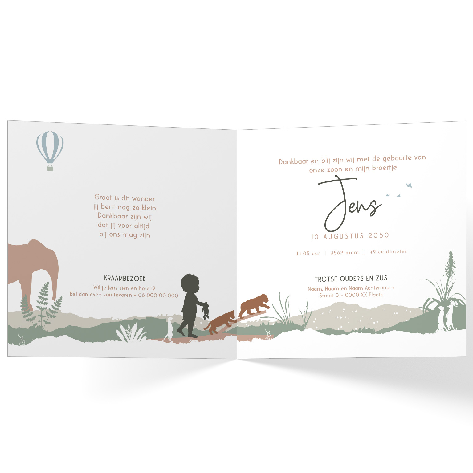 1784-Hip jungle silhouet geboortekaartje voor een tweede kindje, een jongen. Op dit leuke kaartje zie je grote zus hand in hand met haar kleine broertje in de jungle tussen prachtige tropische planten en dieren, zoals een giraf, spelende leeuwtjes, aapjes en stokstaartjes. Grote zus wijst naar een vogeltje..