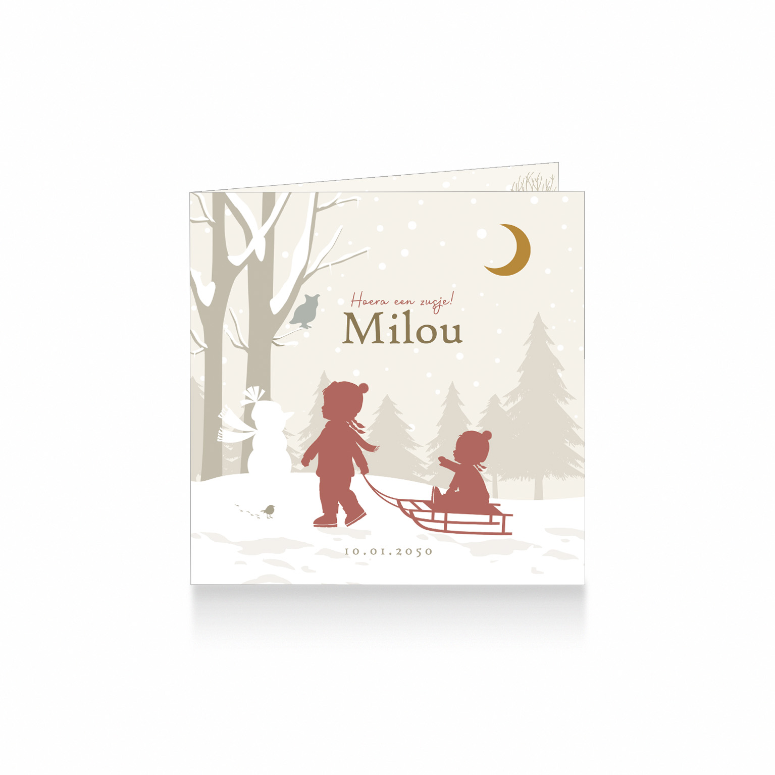 1788-Winter silhouet geboortekaartje voor een meisje van grote zus met klein zusje op slee in winterlandschap aantal
