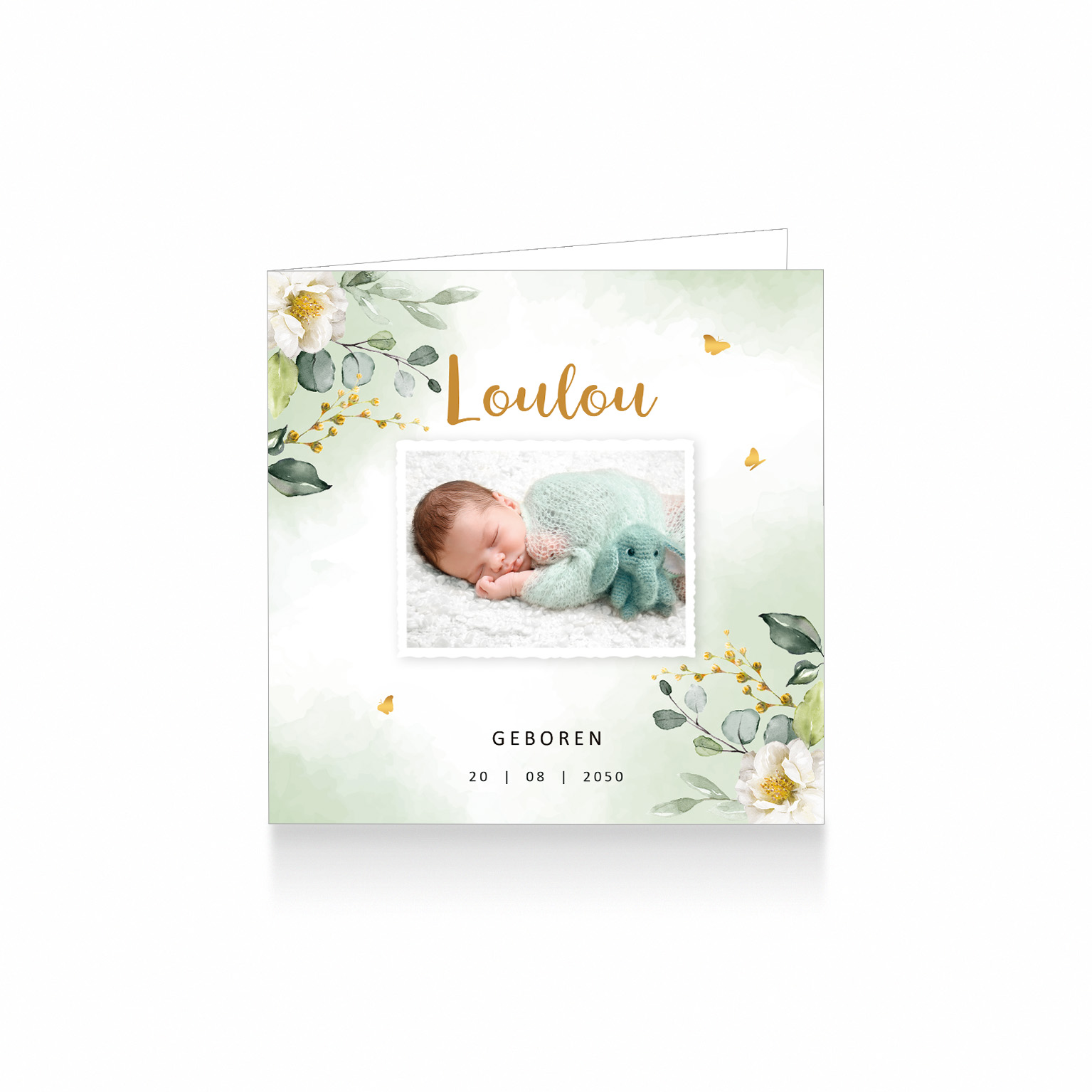 1793-Botanisch waterverf geboortekaartje voor een meisje met foto, geschilderde blaadjes, bloemetjes en vlinders op een groen aquarel achtergrond.