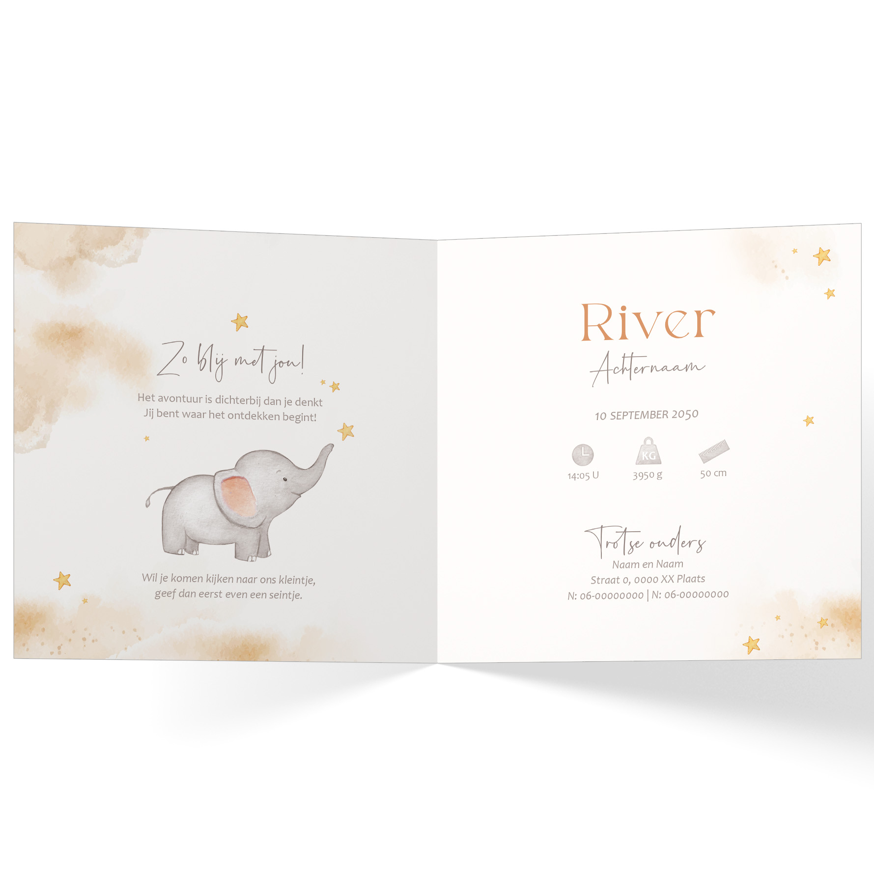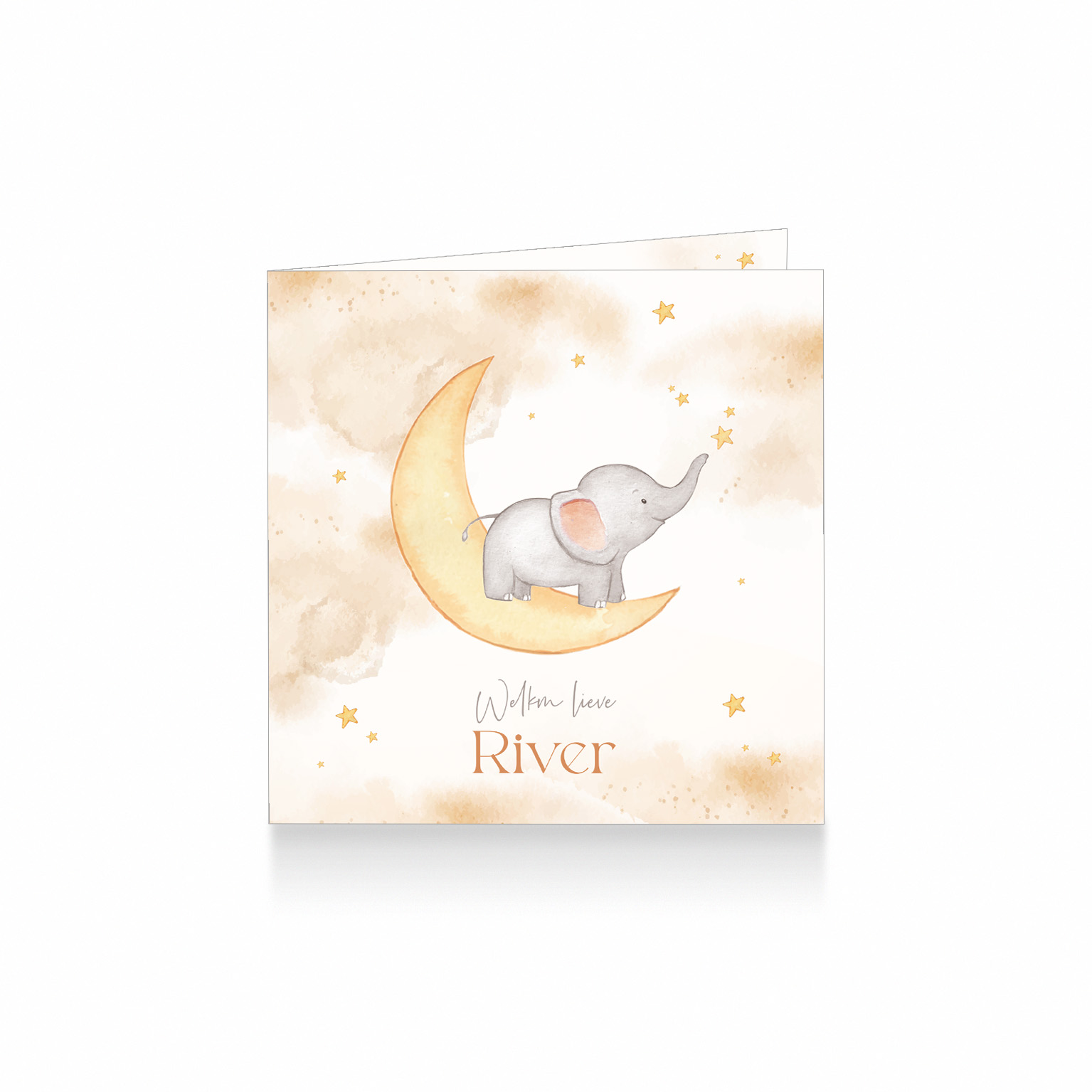 1797-Lief waterverf dieren geboortekaartje voor een meisje met een olifant op een maan en sterren op een aquarel achtergrond.