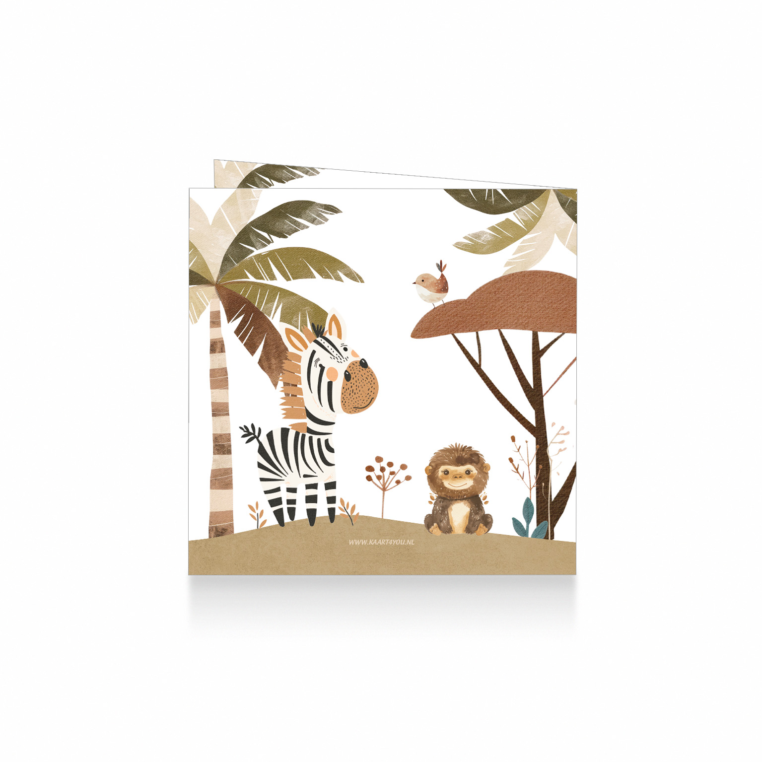 1868-Super leuk aquarel safari jungle dieren geboortekaartje voor een meisje. Op dit leuke safari kaartje in waterverf geschilderd, zie je een jeep met dieren zoals een baby luipaardje, aapjes, flamingo, vogel, kleine panda, giraf en zebra tussen palmbomen, takjes en bloemen