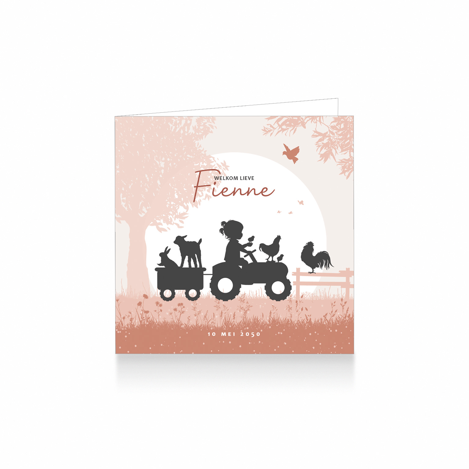 1870-Super leuk silhouet geboortekaartje voor een meisje. Op dit kaartje zie je een meisje op een tractor met een kuikentje in haar hand en op de tractor staat moeder de kip. In een aanhangwagentje zit een lammetje en konijn. in een landschap met een boom, veldbloemen, haan vlinders en vogeltjes.