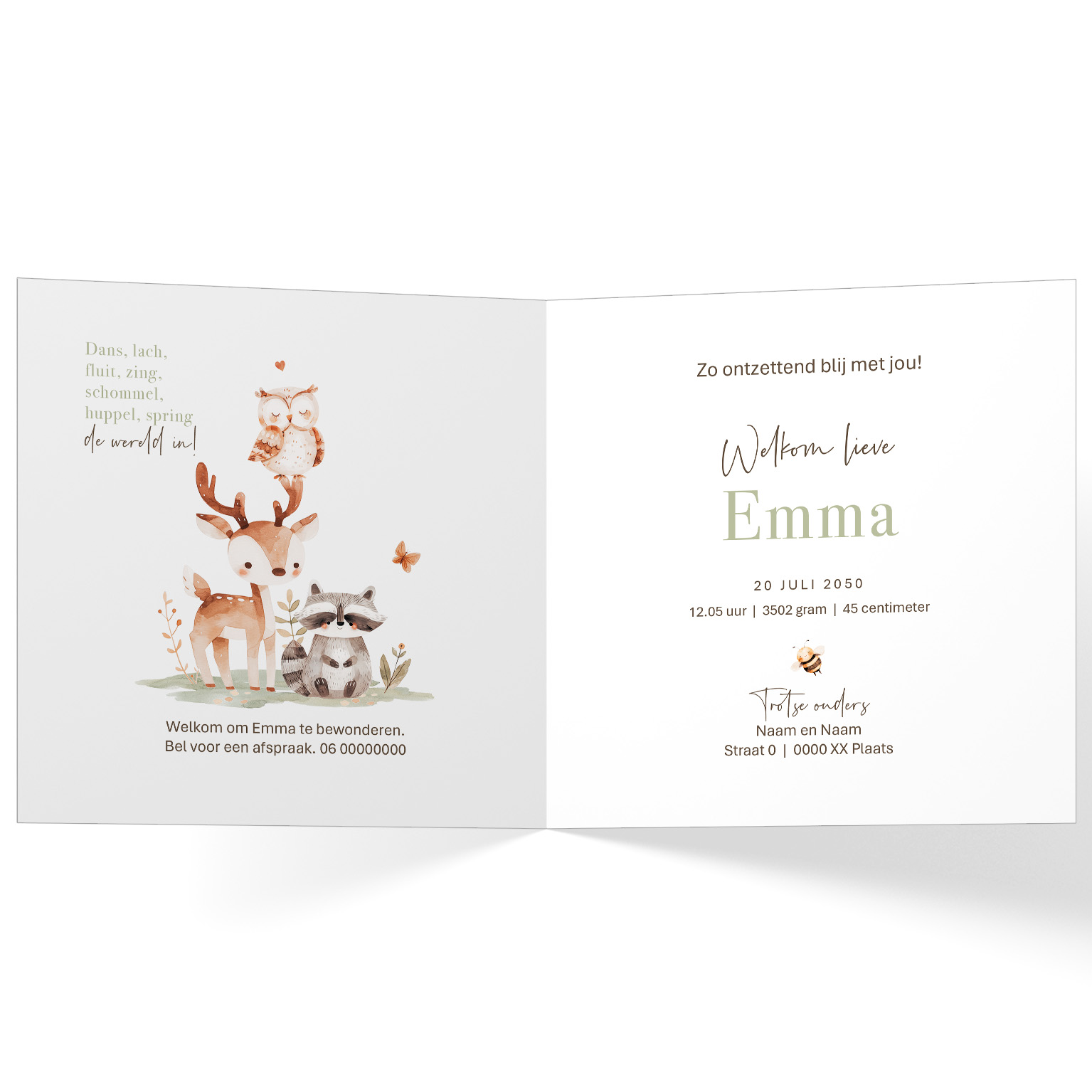 1891-Super schattig aquarel dieren geboortekaartje voor een meisje of jongen met geschilderde bosdieren zoals een beer, vos, bever en wolfje in waterverf bij een boomstronk op een kraft karton achtergrond met bijtje en vlinders aantal