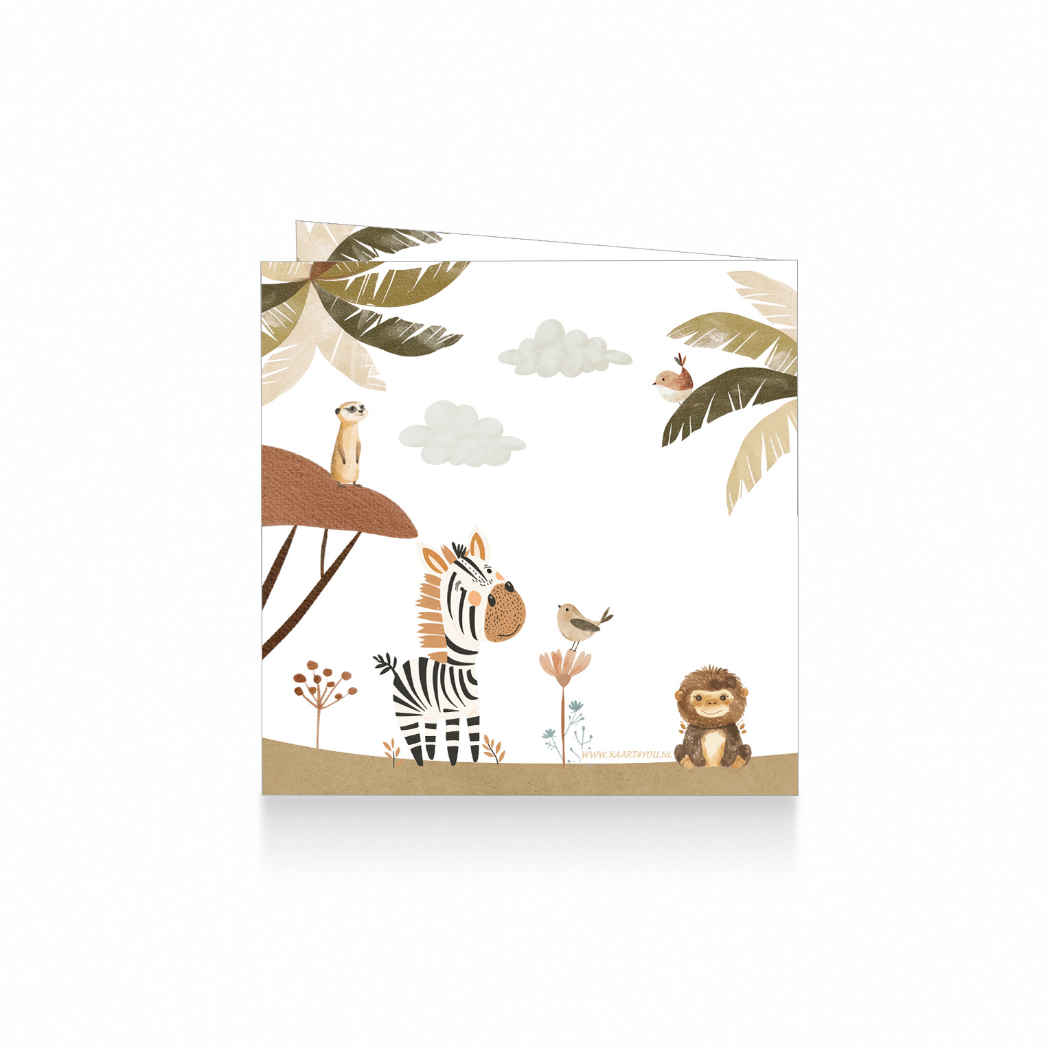 2208-Super leuk aquarel safari jungle dieren geboortekaartje voor een jongen of meisje. Op dit leuke kaartje in waterverf, zie je een jeep met aapje en flamingo, een luiaard, giraf, zebra, stokstaartje en vogeltjes tussen palmbomen, takjes en bloemen